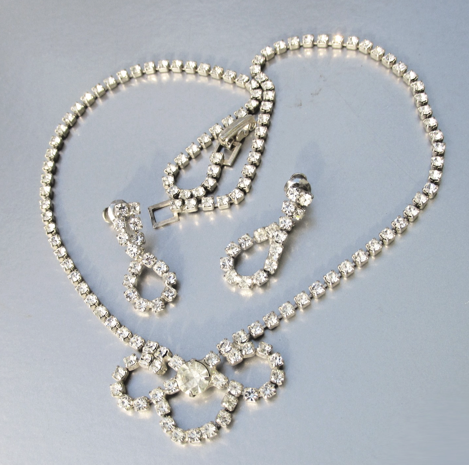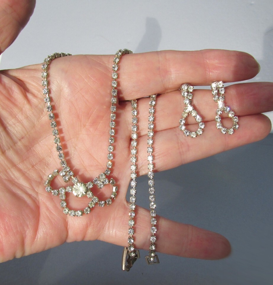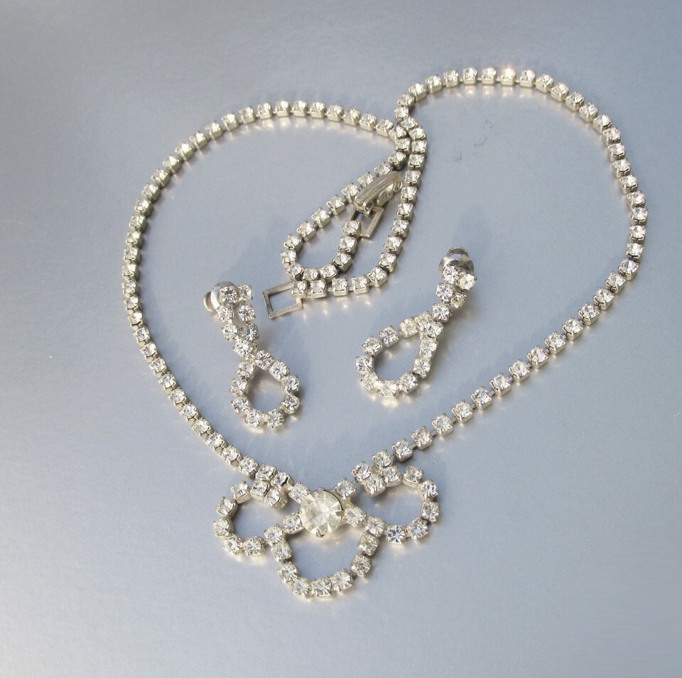 This vintage 1960s-1970s crystal rhinestone 16" long single strand necklace has a center bow plus there is a pair of 1" long dangle pierced earrings. They will be perfect for any dressy occasion such as a wedding, formal party, or a prom. All pieces are in excellent condition with no wear or damage. They will arrive gift boxed. 3324