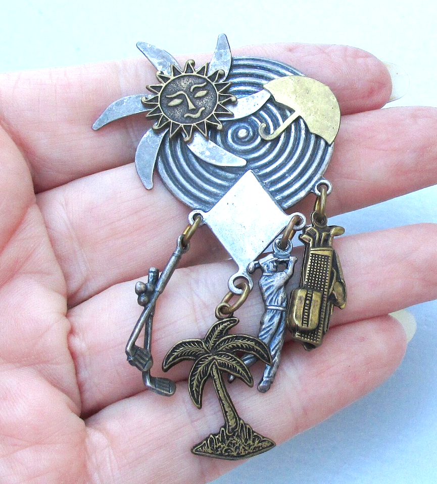 This is a hand made pewter, silver, and copper brooch signed Susan L Richardson and dated 1995. It is a Florida golf pin as it has the shining sun and beach umbrella on top, and dangling charms featuring gold clubs, golfer, and palm tree. It is a large brooch measuring 3" long and it is in excellent condition with no wear or damage. It will arrive gift boxed. 3413