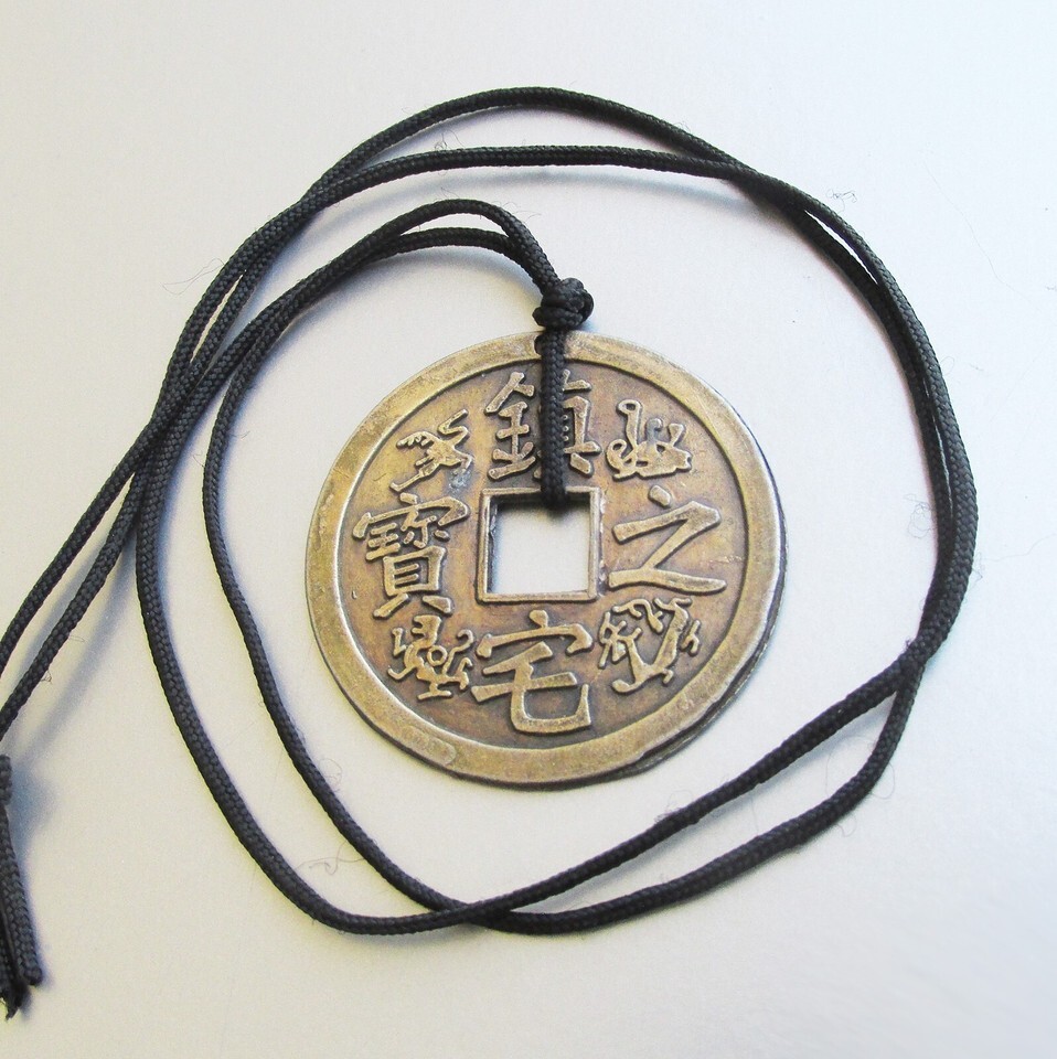 This vintage black cord 25" long necklace has a 1 1/2" diameter brass pendant with Chinese symbols. One side has a tiny bit of wear along the edge, but it has no other wear and no damage. It will arrive gift box. 3194
