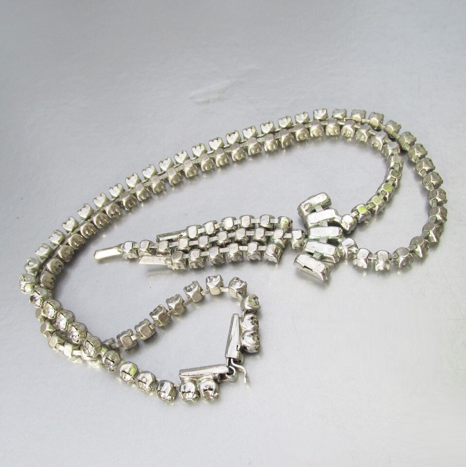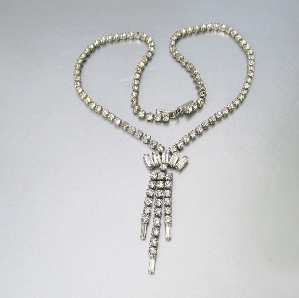 This is a very pretty 1950s vintage 16" long silver-tone prong-set crystal rhinestone necklace with a 2" long center tassel dangle in excellent condition with no wear or damage. It will arrive gift boxed. 3343