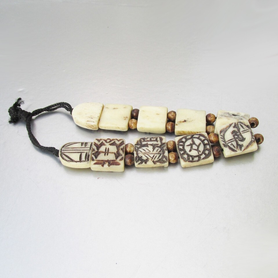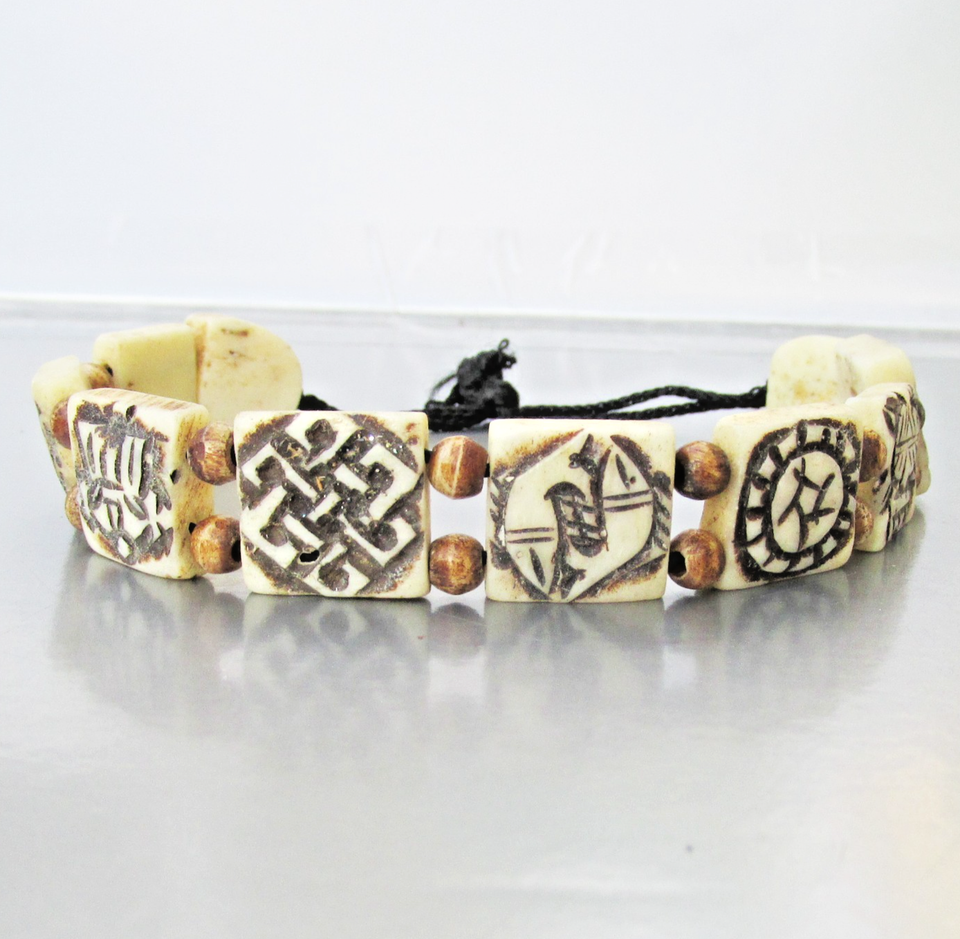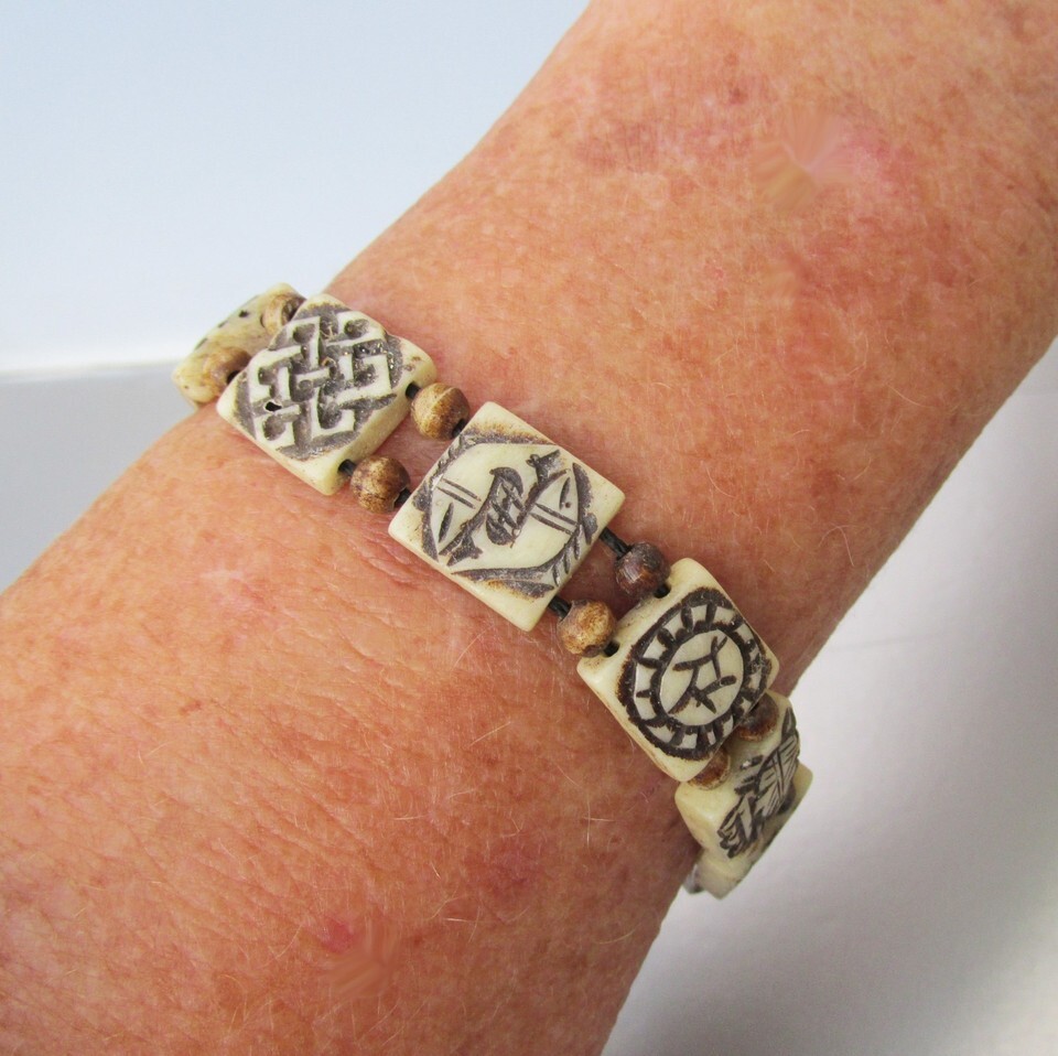 This is a unusual vintage bracelet with ten square horn beads that have black etched Asian designs and symbols. They are strung on black cord with two brown beads in between each. It does NOT STRETCH and measures 8 1/2" long which means you just push it up your arm tightly so it stays put - there is no way to adjust it, latch it, or tighten it in place. PLEASE be sure it will fit you as it is not adjustable. It will arrive gift boxed. 3357