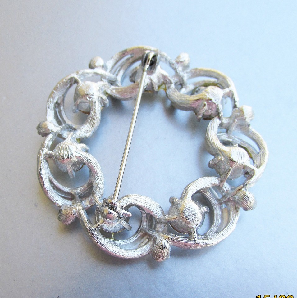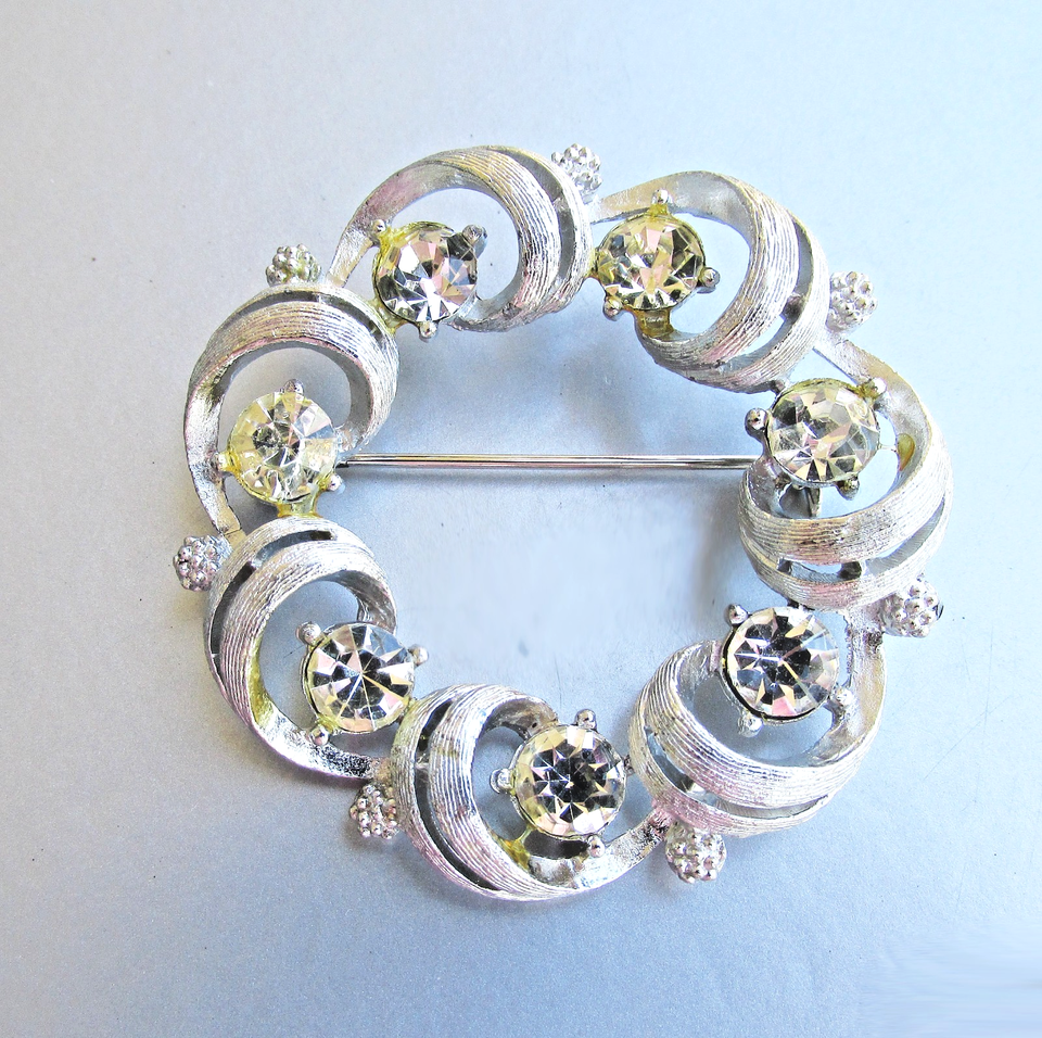 This is a very pretty mid-century 1960s textured silver-tone metal circle pin with swirls with crystal rhinestones. It is in excellent condition with no wear or damage and measures 1 7/8" wide. It will arrive gift boxed. 3488