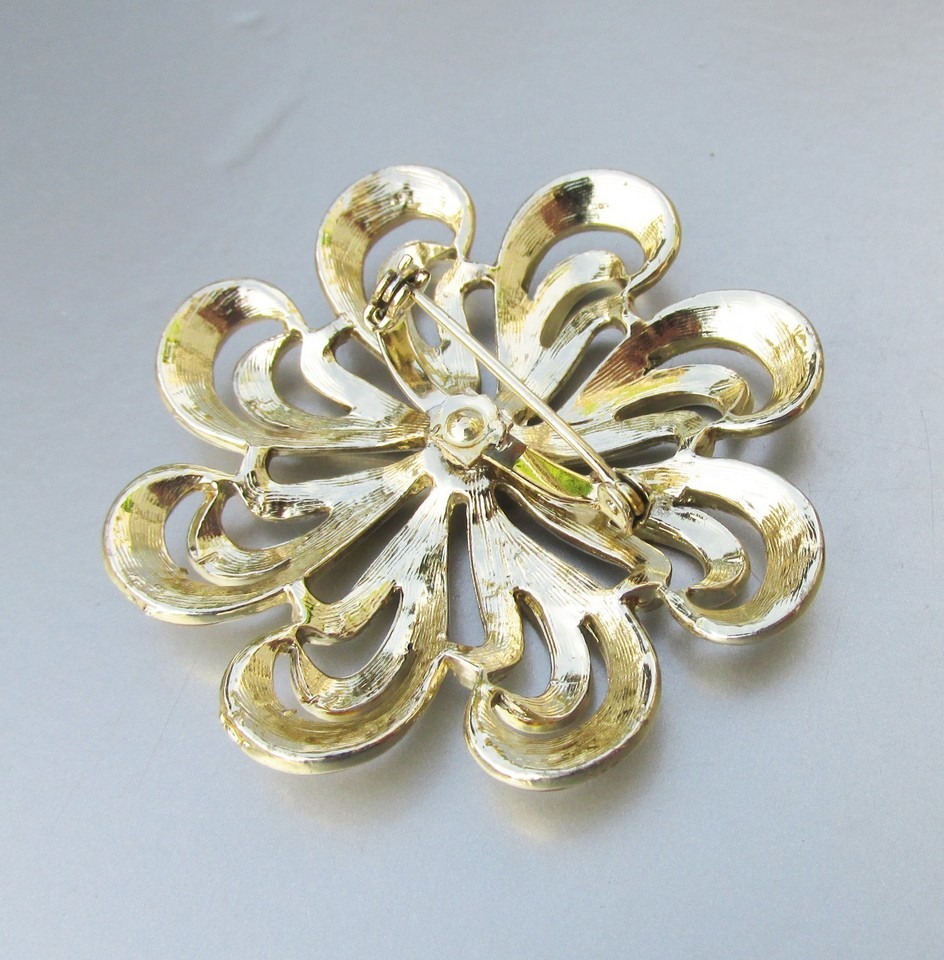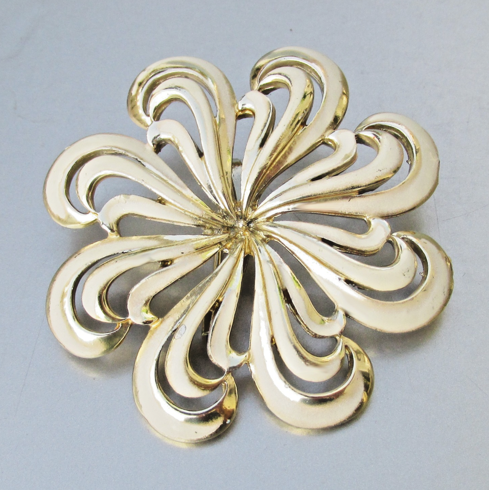 This large 2 1/4" wide vintage 1950s-1960s mid-century gold tone flower shaped brooch has creamy white enamel swirled petals. It is in excellent condition with just a tiny touch of enamel wear which is not noticeable when you wear it. It will arrive gift boxed. 3368