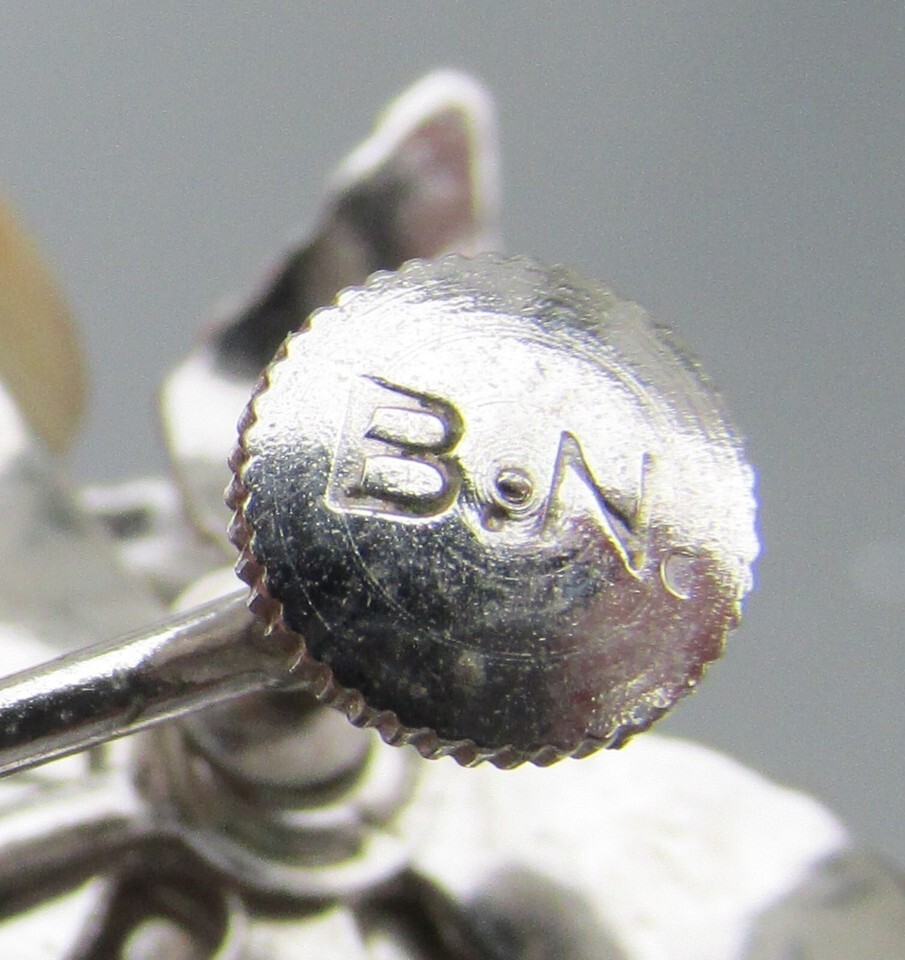 This silver-tone light weight aluminum vintage bracelet and screw back earrings set from the 1930s-1940s has very pretty 3-D roses set with crystal rhinestones. The earrings are signed B.N. for the Bugbee Niles Co. in business 1896-1943. The bracelet measures 6 3/4" long which is a bit smaller than average, and the earrings are 1 1/8" long. The set is in excellent condition with no damage and no wear. It will arrive gift boxed. 2675