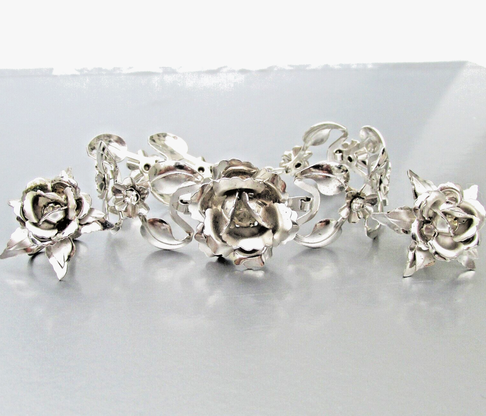 Signed Bugbee Niles Aluminum 3-D ROSE Rhinestone Bracelet Vtg Earrings Set