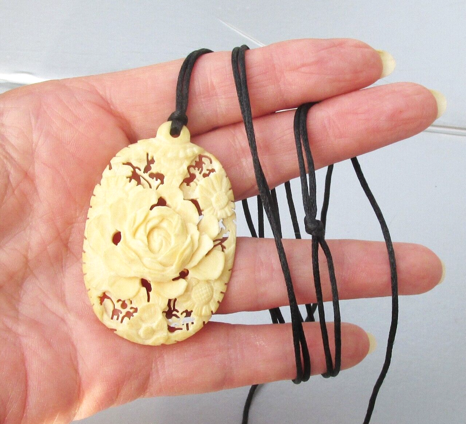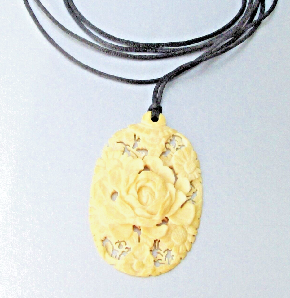 Antique Finely Carved ROSE Flower Pendant Black Silk Cord Vtg Necklace