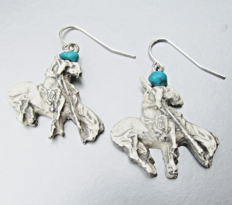 These vintage pierced earrings have sterling silver ear wires, a dangling light weight acrylic cowboy on a horse, and a turquoise nugget on top of his head. They measure 1 2/2" long from the top of the ear wires and 1" wide. They are in excellent condition with no wear or damage. They will arrive gift boxed. 2833