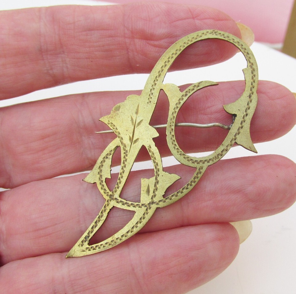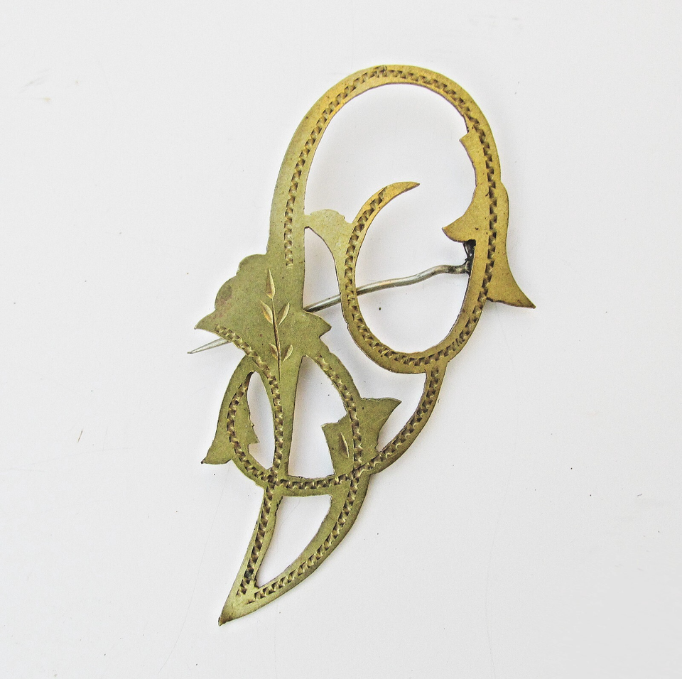 This is a gold plated brass antique brooch from the early 1900s Art Nouveau period. It has a swirled and flowing calla lily and leaves design and is 2 1/2" tall. It has an open "C" clasp which is normal for the time period, and there is a bit of waviness in the pin back from when it was hand made. It is in excellent condition with no wear or damage. It will arrive gift boxed. 3224