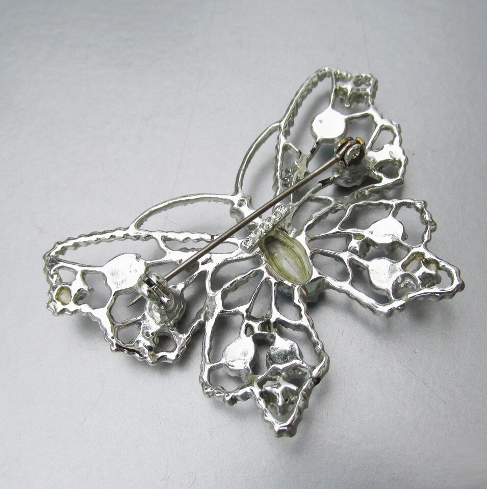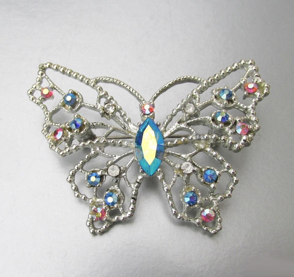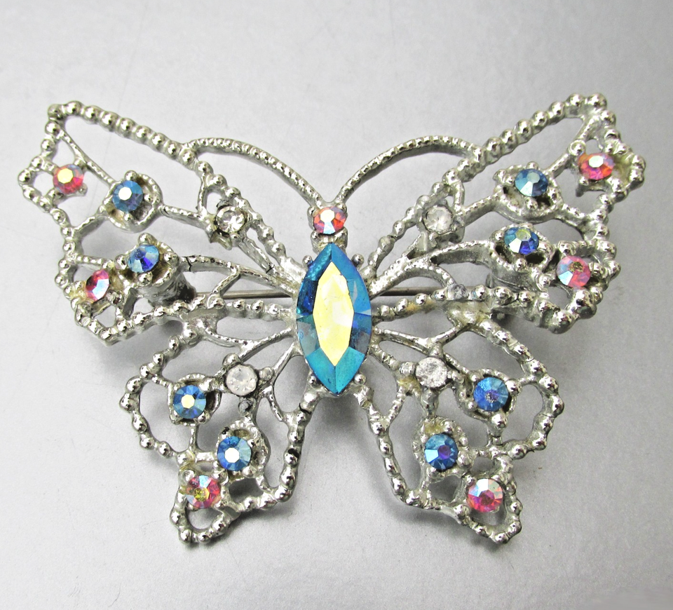 Vtg DODDS Silver Tone Blue Pink AB Rhinestone BUTTERFLY Brooch Pin