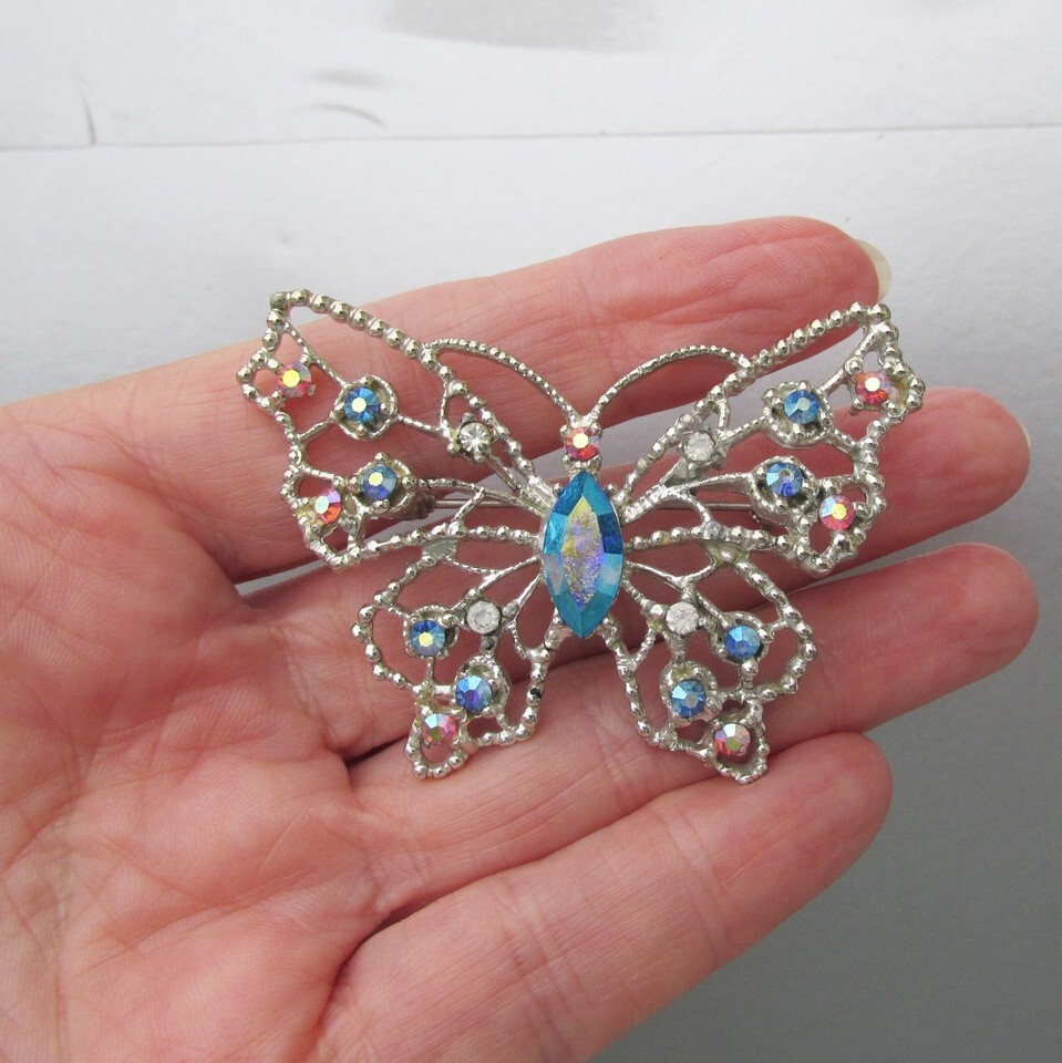 This very pretty vintage 1960s silver tone butterfly brooch is signed DODDS as pictured. It is a large brooch measuring 2 1/2" wide and set with sparkling blue, pink, and crystal rhinestones with the aurora borealis finish. It is in excellent condition with no wear or damage. It will arrive gift boxed. 2744