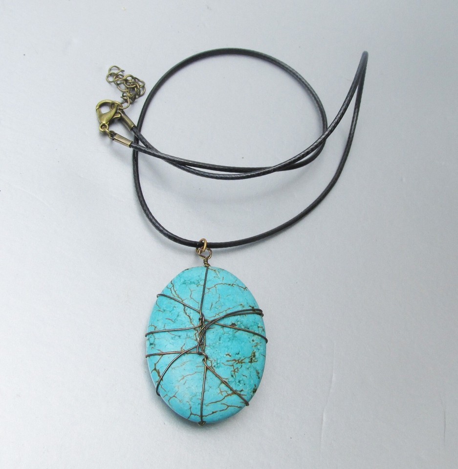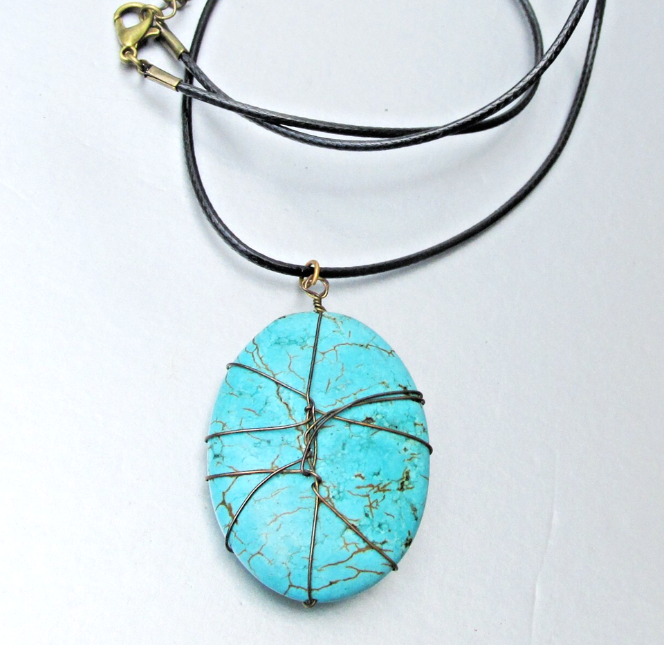 Copper Wire Wrapped TURQUOISE Large Pendant Vintage Cord Necklace