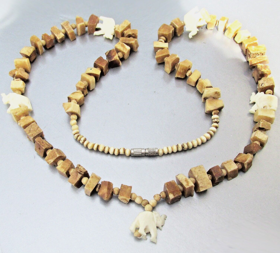 Vtg 1960s Mid-Century Carved Shell Elephant & Chunky Square Bead Long Necklace