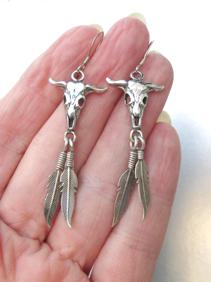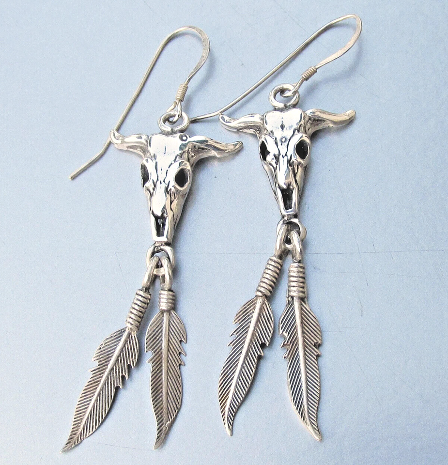 Sterling Silver Native Southwestern Cow Skull Feather Vintage Dangle Earrings