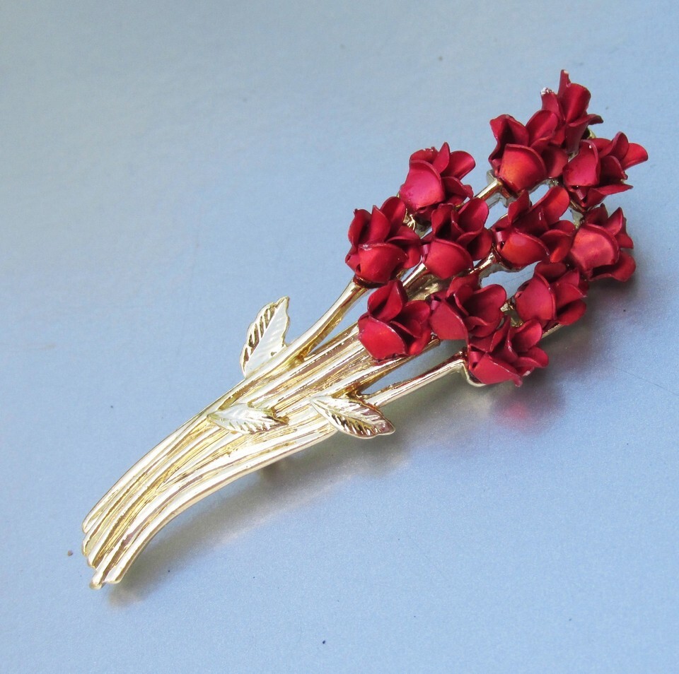 Danbury Mint Signed DM 97 Red Enamel ROSE BOUQUET Gold Tone Vtg Brooch Pin