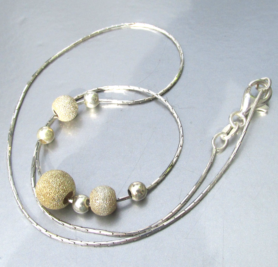 This is a vintage 1980s-1990s sterling silver 16" long necklace with three gold on sterling silver textured beads with small sterling spacer beads. The chain is a thin bar link and has a lobster claw clasp. It is signed Italy and 925 for sterling. It is in excellent condition with no wear or damage. It will arrive gift boxed. ID#3000