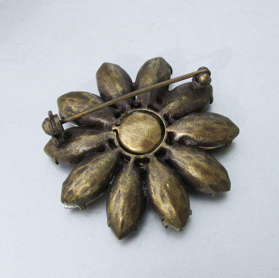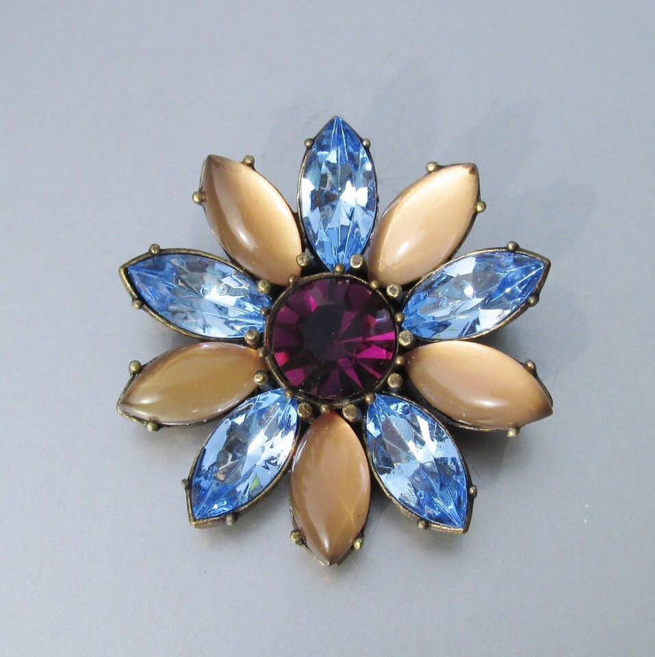 This is a vintage 1960s dark brass and purple, blue, and tan rhinestone 1 3/8" wide flower brooch. It is in excellent condition with no wear or damage. It will arrive gift boxed. 2998