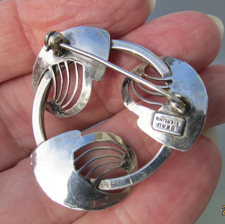This vintage 1940s-1960s signed "Beau Sterling" mid-century modern circle pin has three attached swirls with open work filigree. It is in excellent condition with no wear or damage and measures 1 1/2" wide. It will arrive gift boxed. 2891