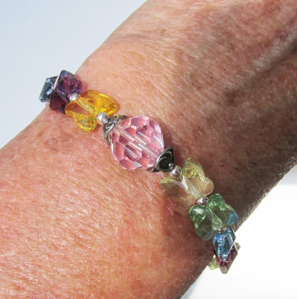 This is a beautiful vintage early 2000s handmade stretch bead bracelet with multi-color genuine Swarovski butterfly shaped beads, two large round pink crystals in the center, plus sterling silver bead caps and spacer beads. It measures 7" long and will stretch to fit a wrist up to several inches longer. It is in excellent condition, like-new with no signs of any wear. It will arrive gift boxed. 3018