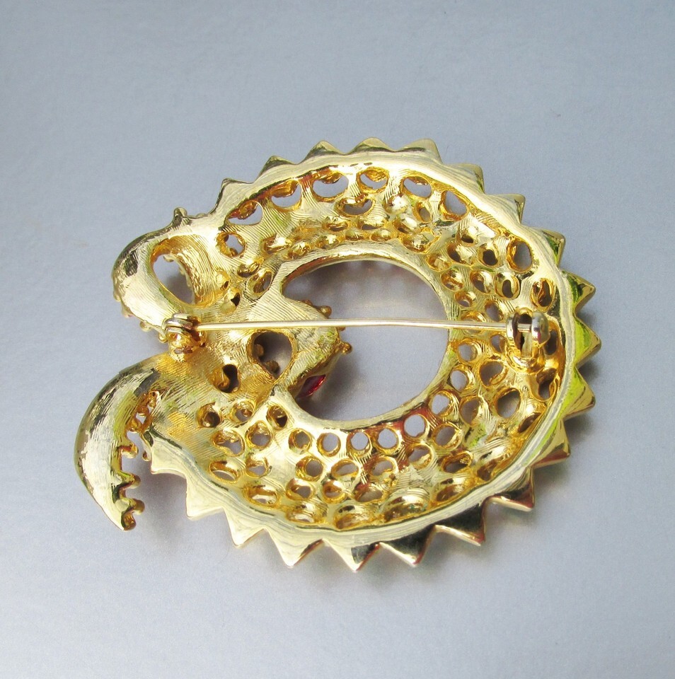 This is a very pretty vintage 1990s gold tone wreath brooch set with crystal rhinestone and green and red enamel. It is in like-new mint condition and measures 1 7/8" long and 2" wide. It will arrive gift boxed. 3157