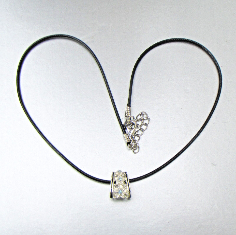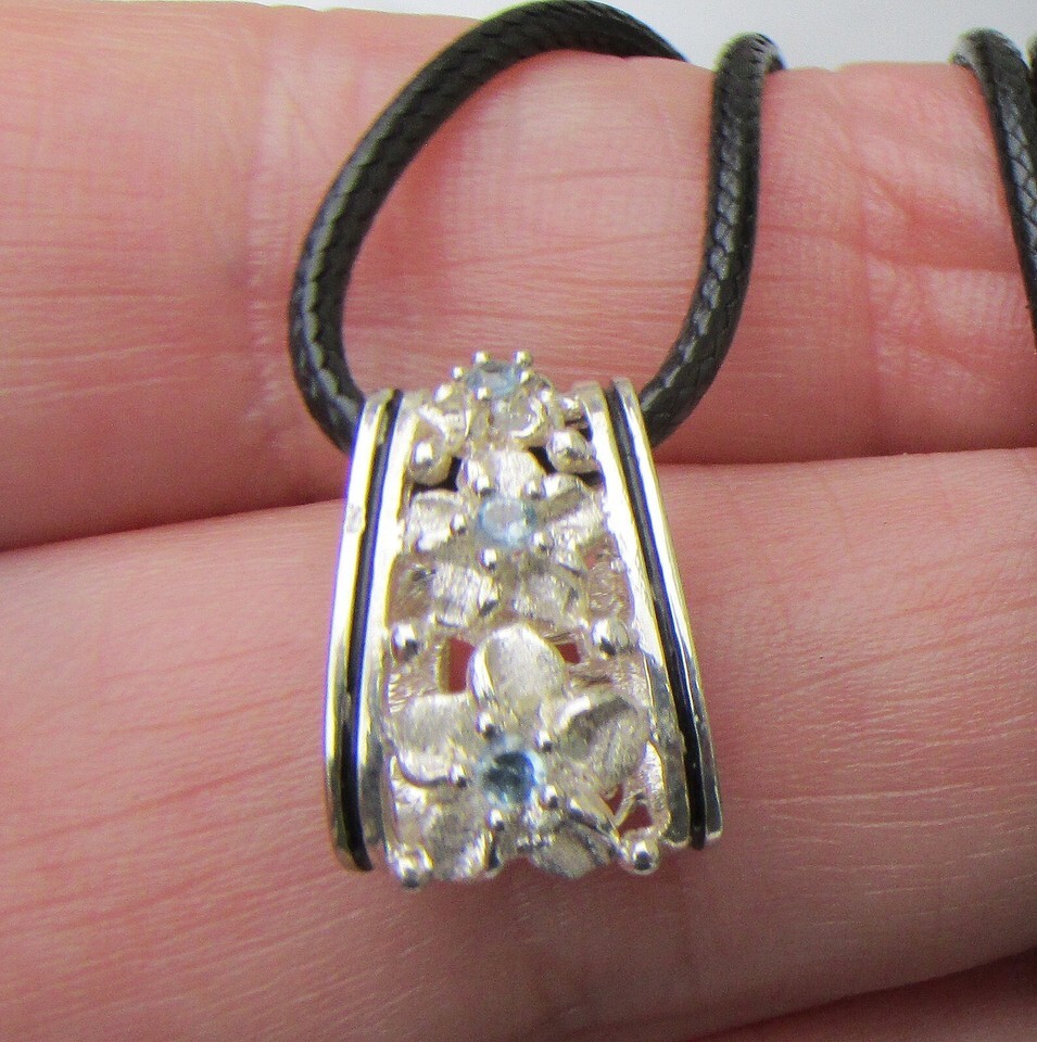 This very pretty vintage black cord necklace has a sterling silver pendant with three flowers on the front that have light blue rhinestone centers. The 1/2" long pendant can also be used as a bail to hang another pendant below it. The pendant is signed 925 for sterling silver and has a B or E mark. The cord is 18" long and has a 2" extender chain. It is all in excellent condition with no wear or damage. It will arrive gift boxed. 3074