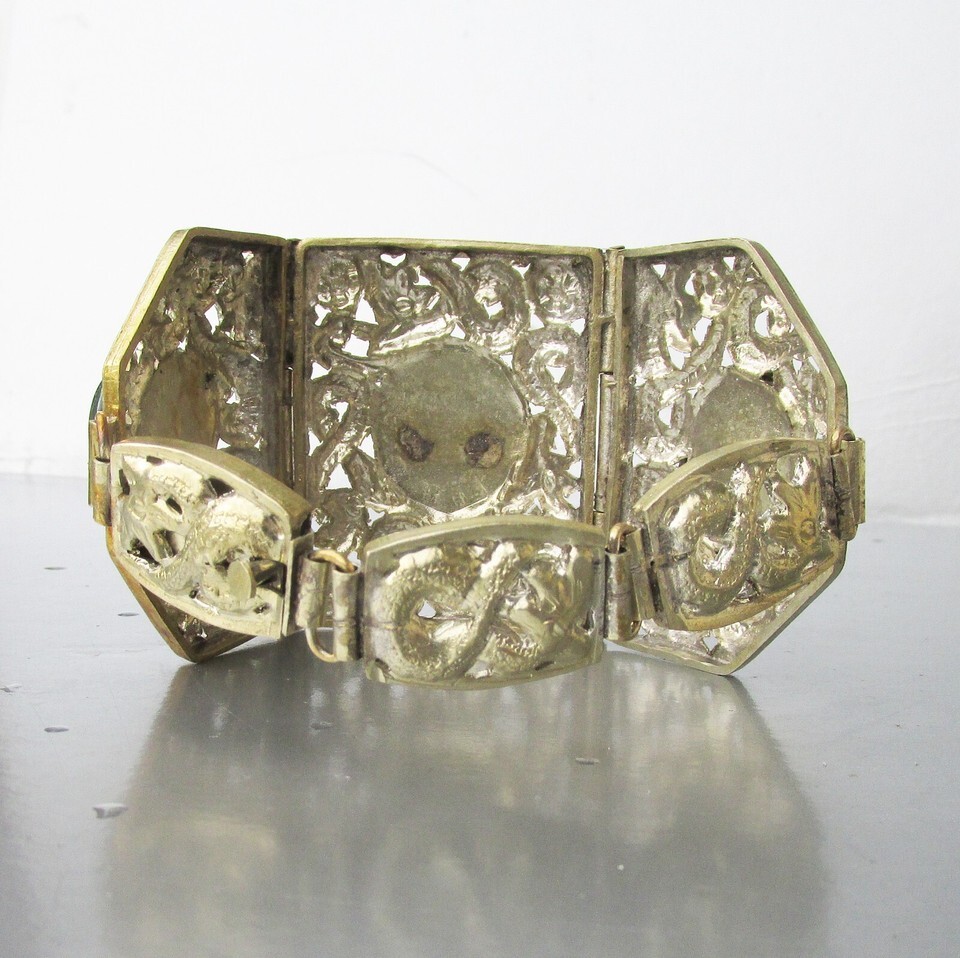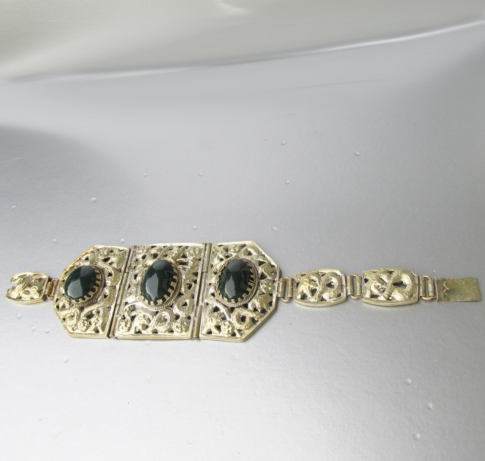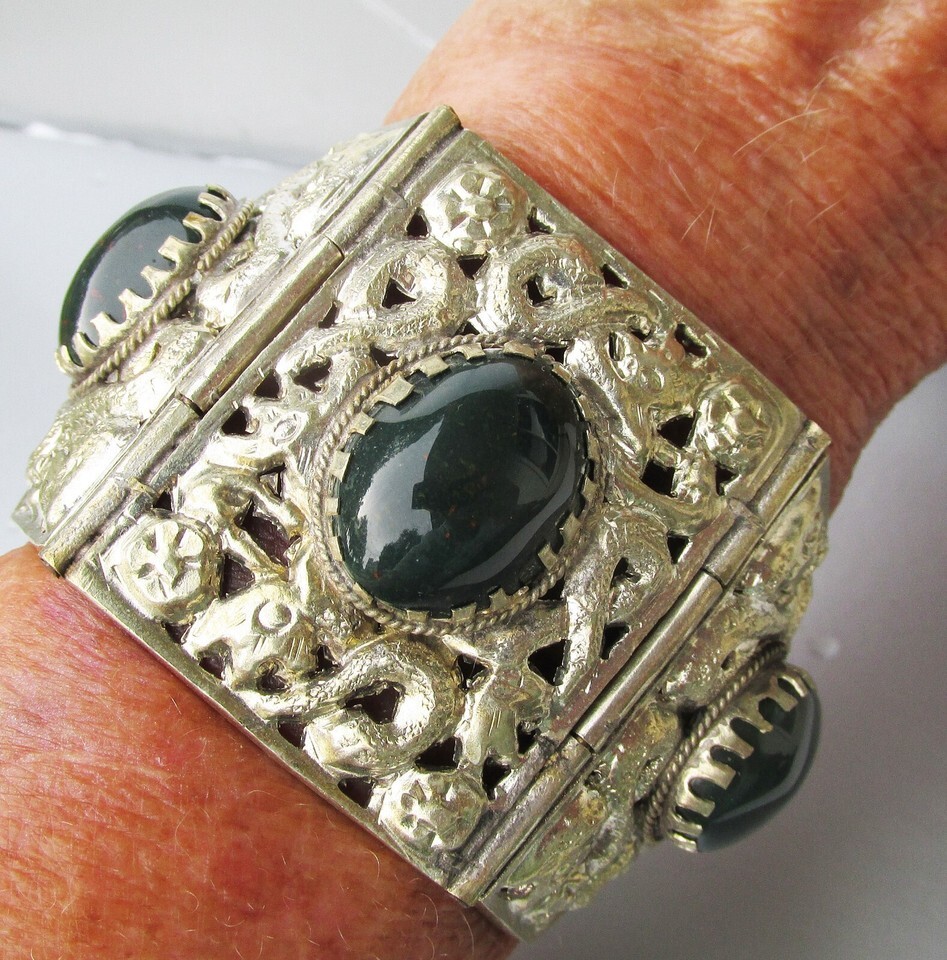 This big and wide vintage silver-plated white metal bracelet has an open work snake design with three 1 7/8" wide center sections set with big oval bloodstones. Bloodstone is a very dark green gemstone with red spots of iron oxide that resemble drops of blood and it is a type of chalcedony and is also known as heliotrope. The back of the bracelet is a wide chain with three sections and it ends with a secure slide lock clasp and it is 8" long so it will fit higher up your arm if you have average sized wrists. It is in excellent condition with no wear or damage - just a few spots on the back where it was tested for silver content in the past. It will arrive gift boxed. 3481