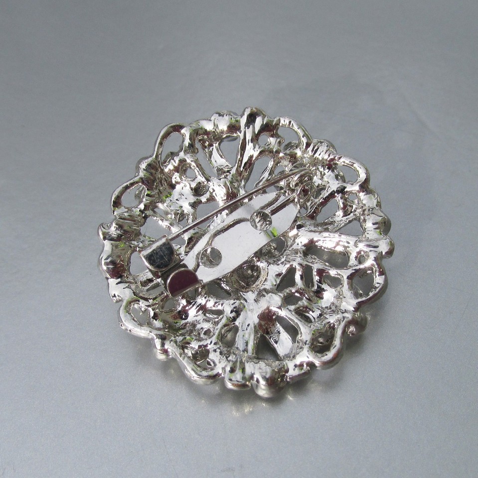This very pretty, bright and sparkling silver-tone circle brooch from the 1950s-1960s has little flowers and is set with crystal rhinestones. It measures 1 3/8" in diameter and is in excellent, like new condition with no wear or damage. It will arrive gift boxed. 3134