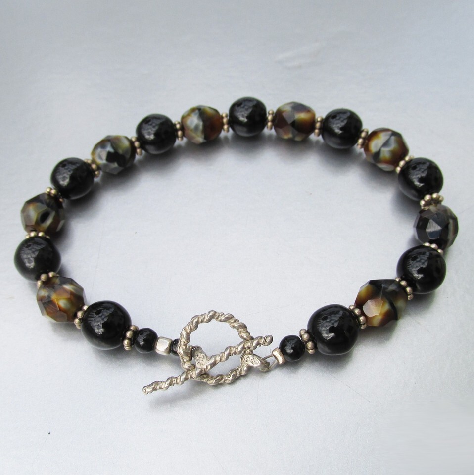 Handmade Vintage Sterling Silver Toggle Brown & Black Bead Bracelet 7 1/2"