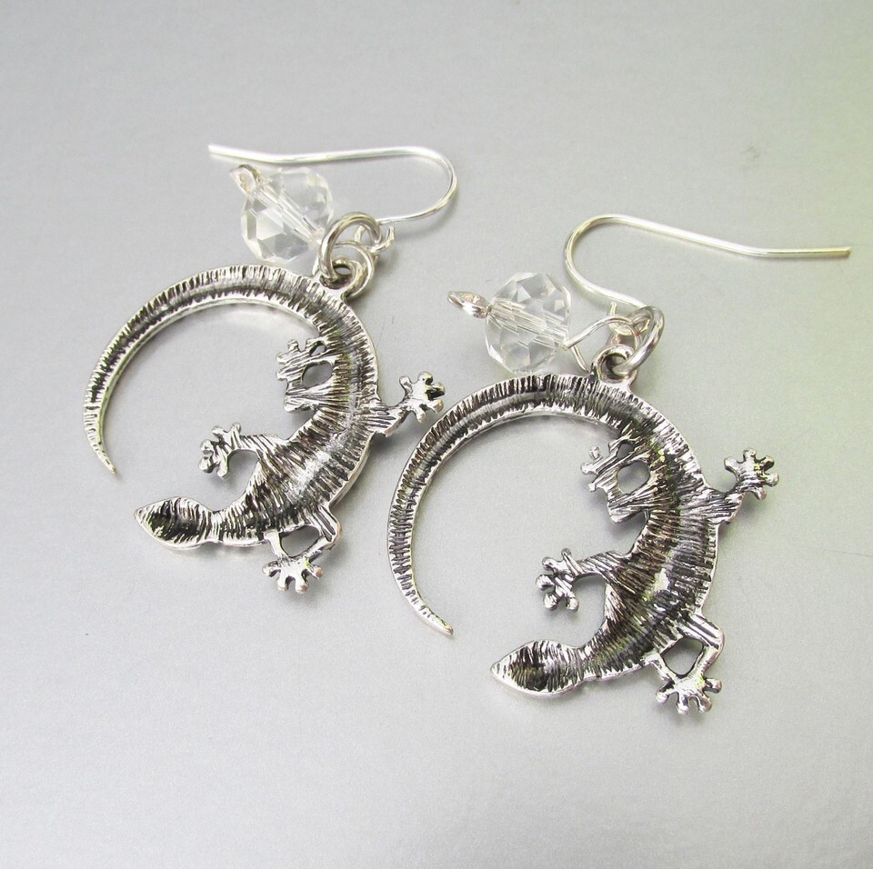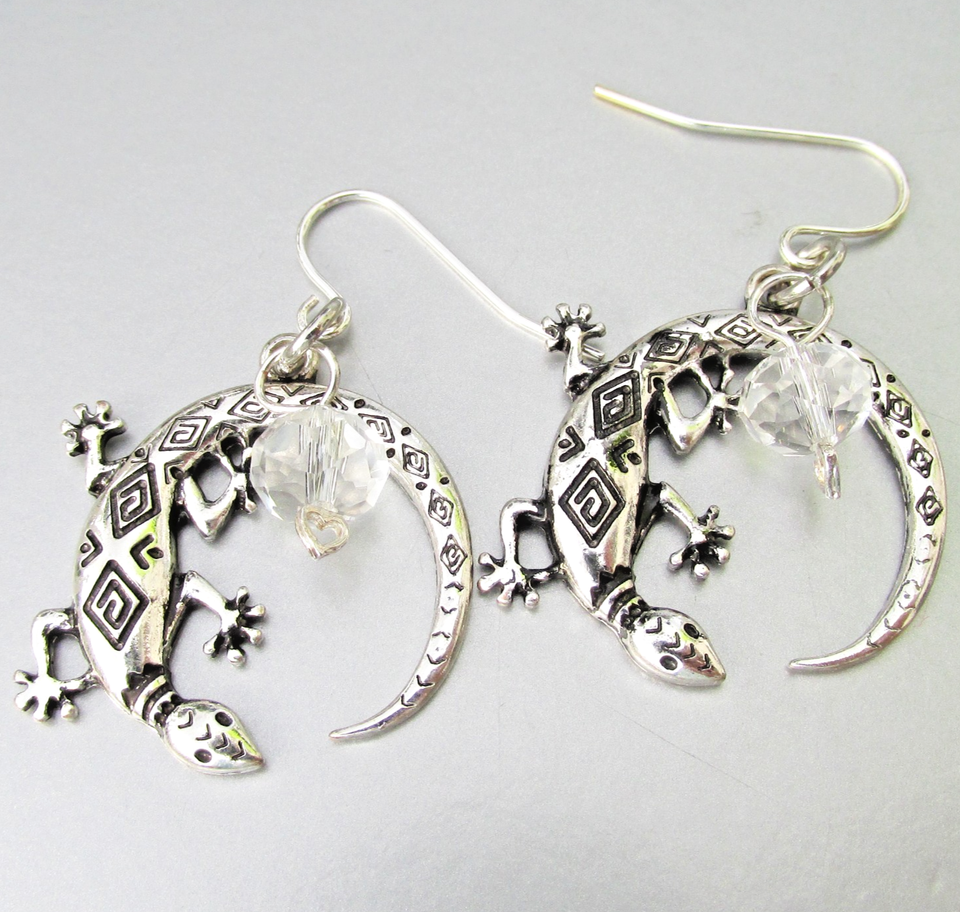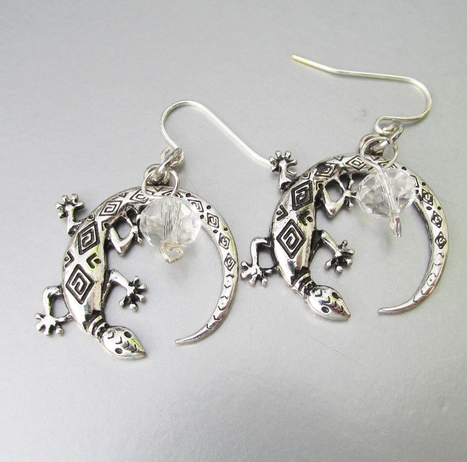 This pair of hand crafted pierced dangle earrings have 1" wide round stone tone lizards with dangling crystal beads hanging 1 1/2" long from sterling silver ear wires. They are brand new, never worn, in mint condition. They will arrive gift boxed. 2863