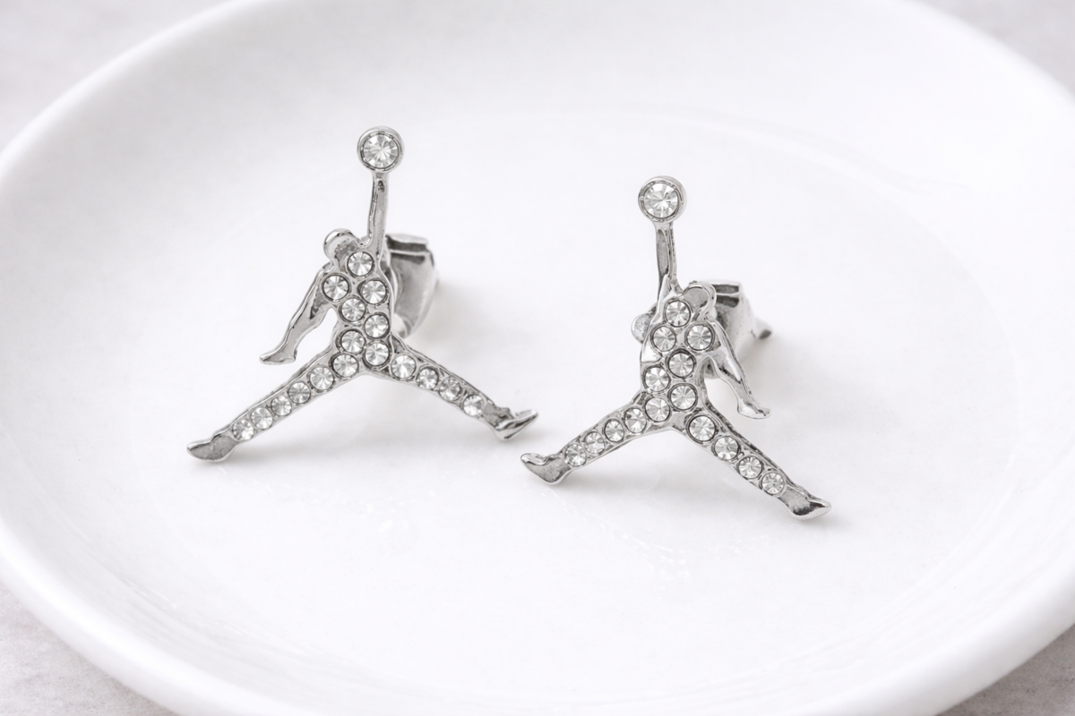 Silver-plated stud earrings in the shape of the classic Michael Jordan slam dunk pose adorned with clear European crystal rhinestones