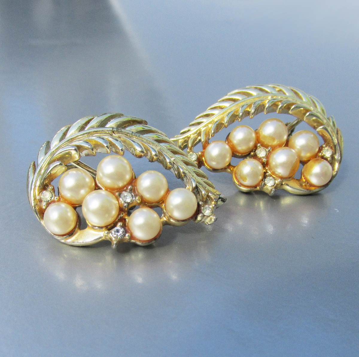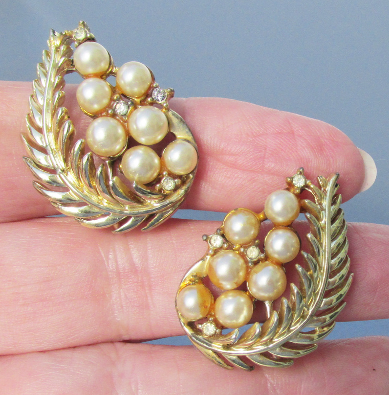 This is a pair of signed Coro, with the copyright symbol, gold-tone vintage clip earrings from the 1940s- early 1950s. They are 1 3/8" tall curved leaves with creamy off-white faux pearls and tiny crystal rhinestones. They are in excellent condition, like new with no wear or damage. They will arrive gift boxed. 3546