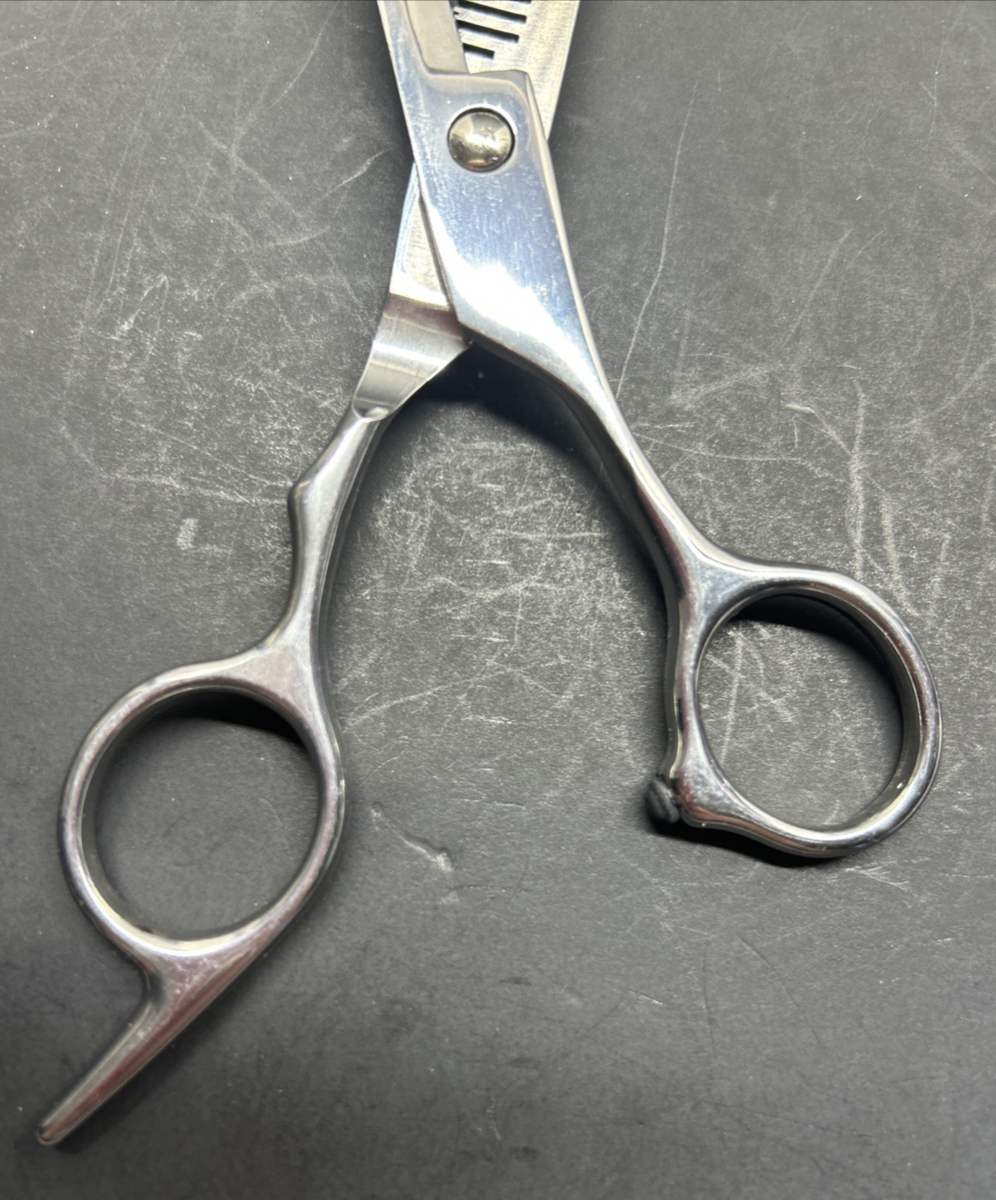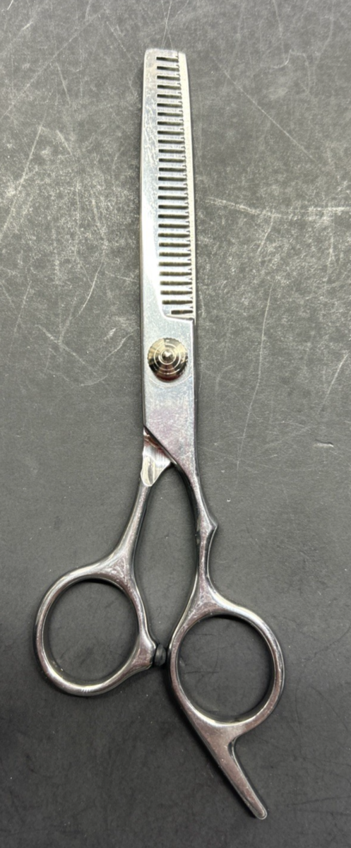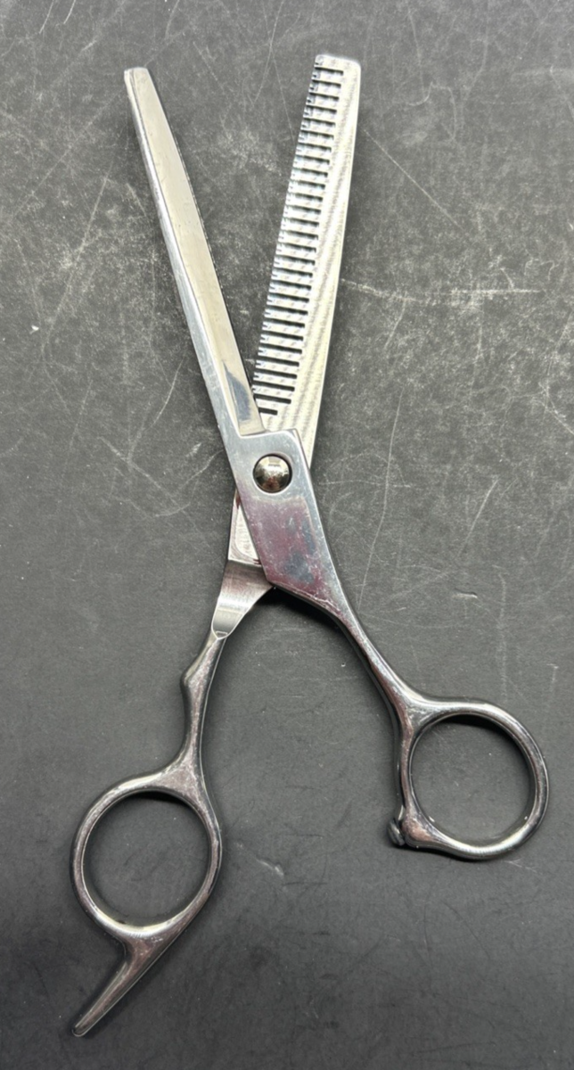 Right?handed 6.5" thinning shears made of silver stainless steel, ideal for trimming bulk, blending layers, and softening lines in men?s and women?s haircuts. These are unbranded but well?made, with a smooth action and comfortable finger rest.