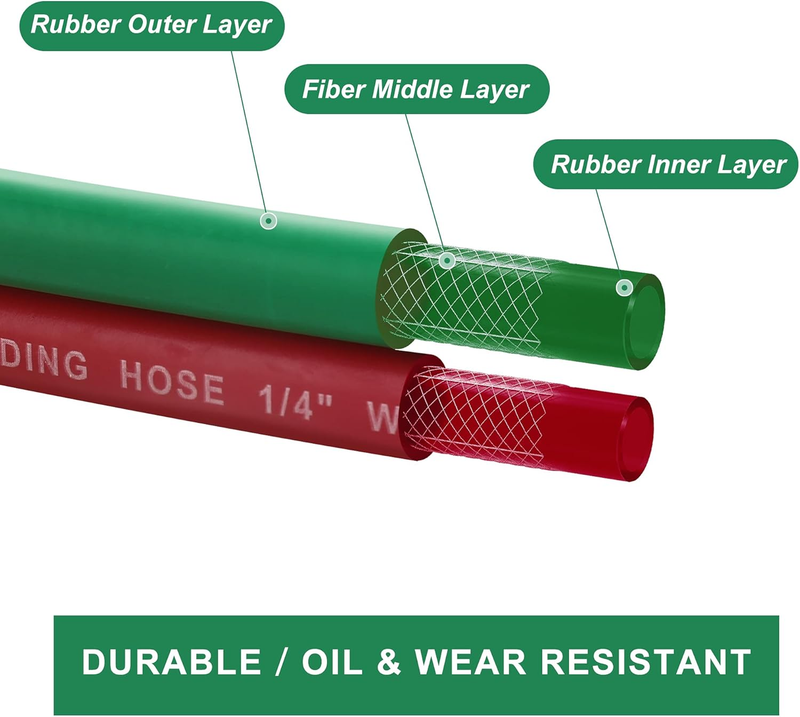 1/4? 25FT: The length of each welding hose is 25 feet. It is long enough for daily life use or industry and agriculture use. The inner diameter of hose is 1/4 inch(6.3mm) which supply optimal flow rate in the maximum pressure of 300 PSI (20Bar).