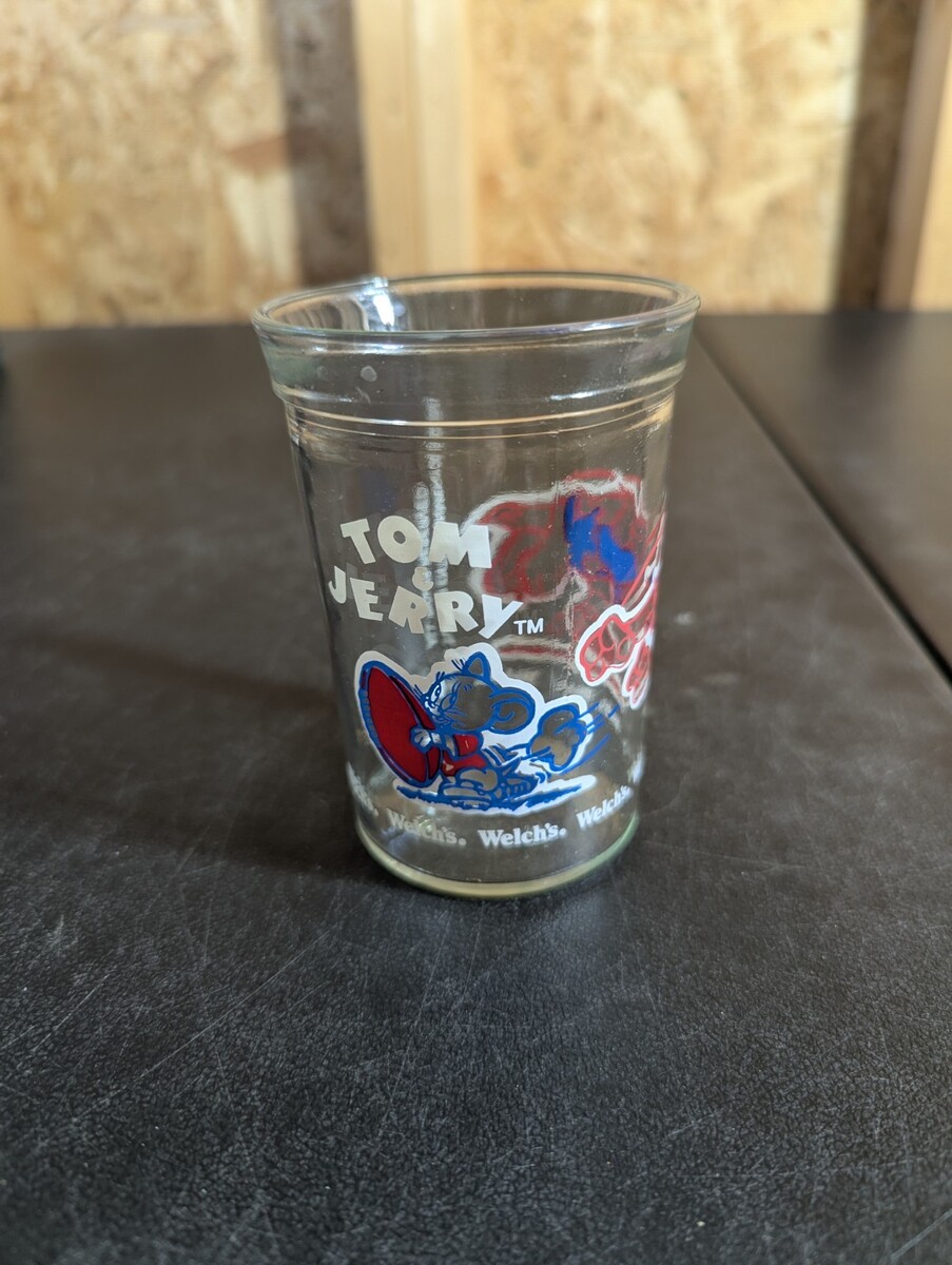 The product is a vintage 1991 Welch's Jelly Juice Glass Tumbler featuring Tom Jerry characters in a football setting. The tumbler is embossed with multi-color graphics depicting the iconic cat and mouse chase scene. This original piece of advertising memorabilia is a unique collectible item associated with the Welch's brand and the theme of jam, jelly, and peanut butter. Perfect for fans of Tom Jerry or collectors of vintage advertising items, this glass tumbler captures a nostalgic moment in popular culture history.