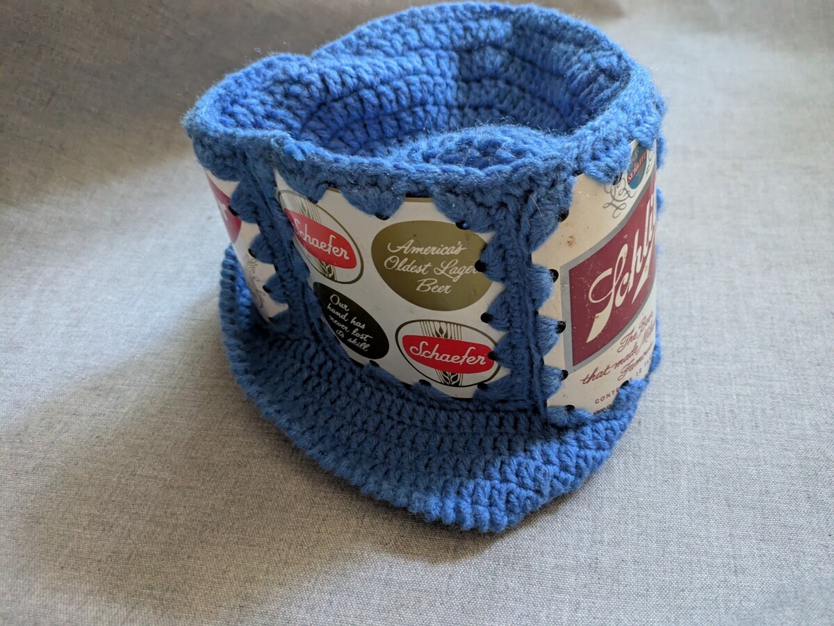 Vintage Blue Crocheted Budweiser Schlitz Schaefer Beer Can Knit Bucket Party Hat