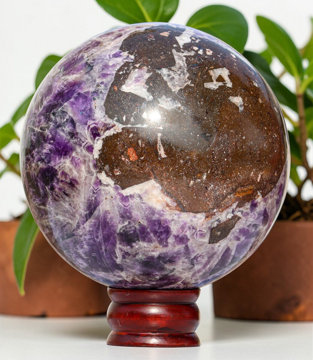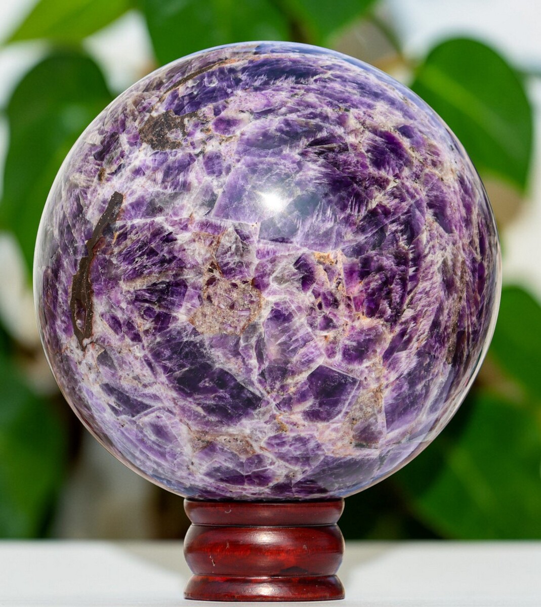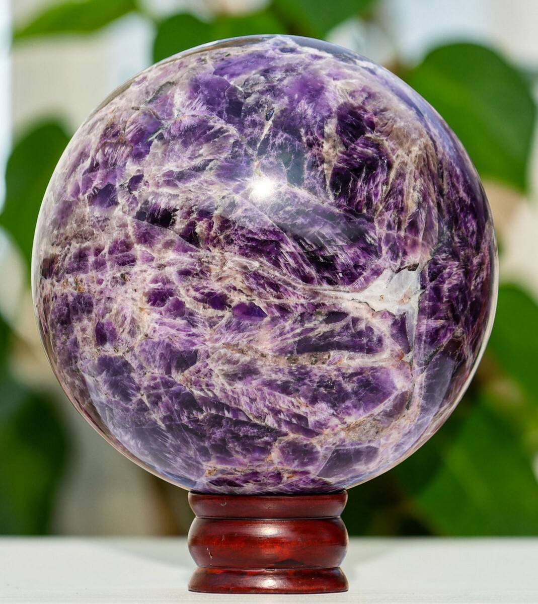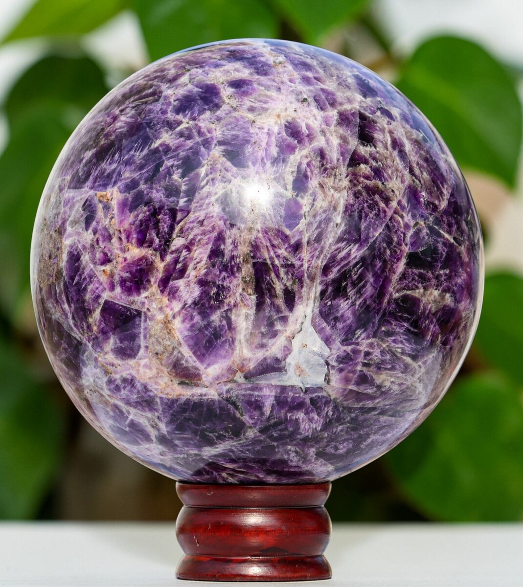 A purple amethyst crystal stone carved into a sphere is valued for its ability to radiate calming and protective energy equally in all directions, making it an excellent tool for promoting peace, balance, and spiritual growth.