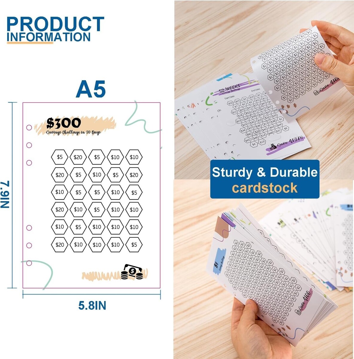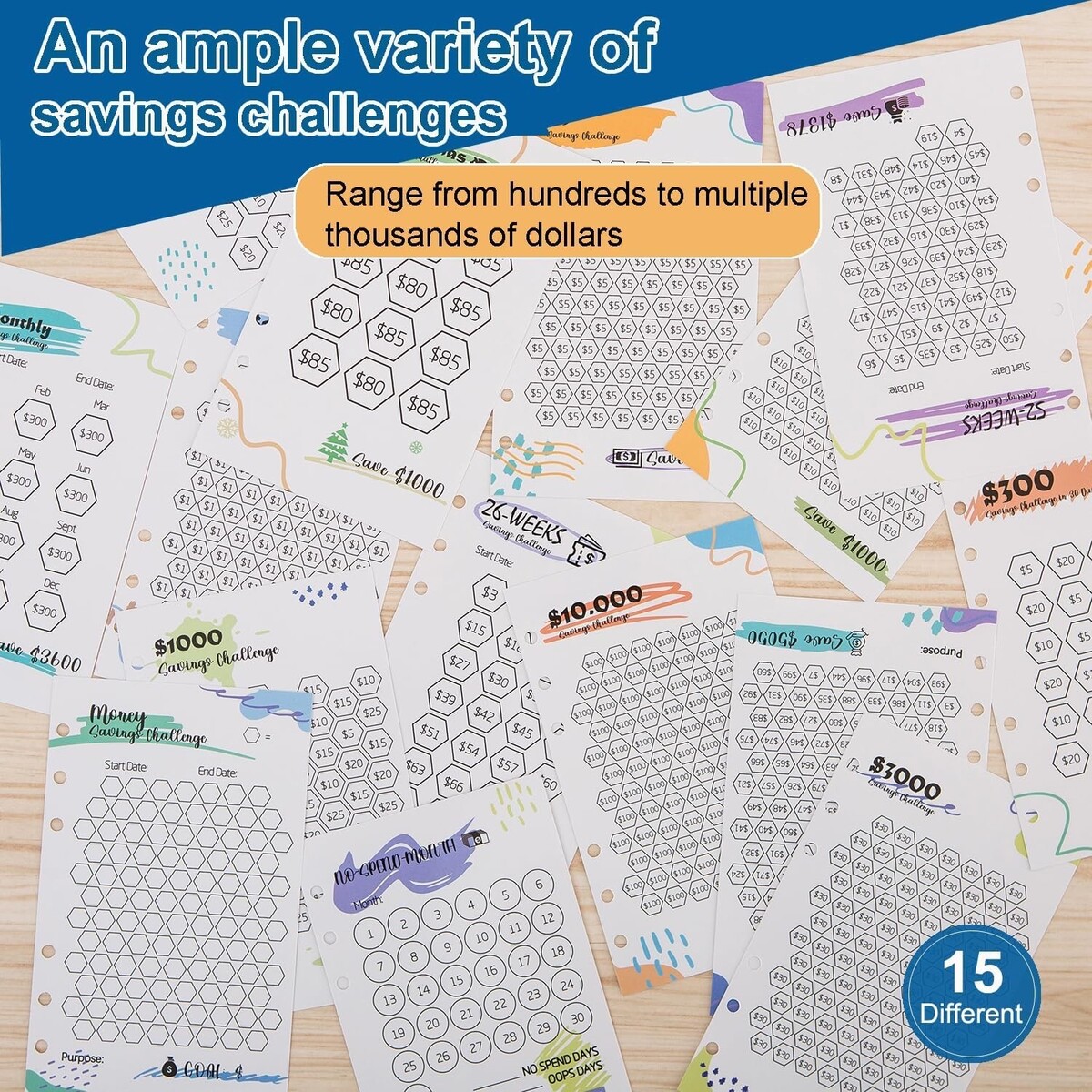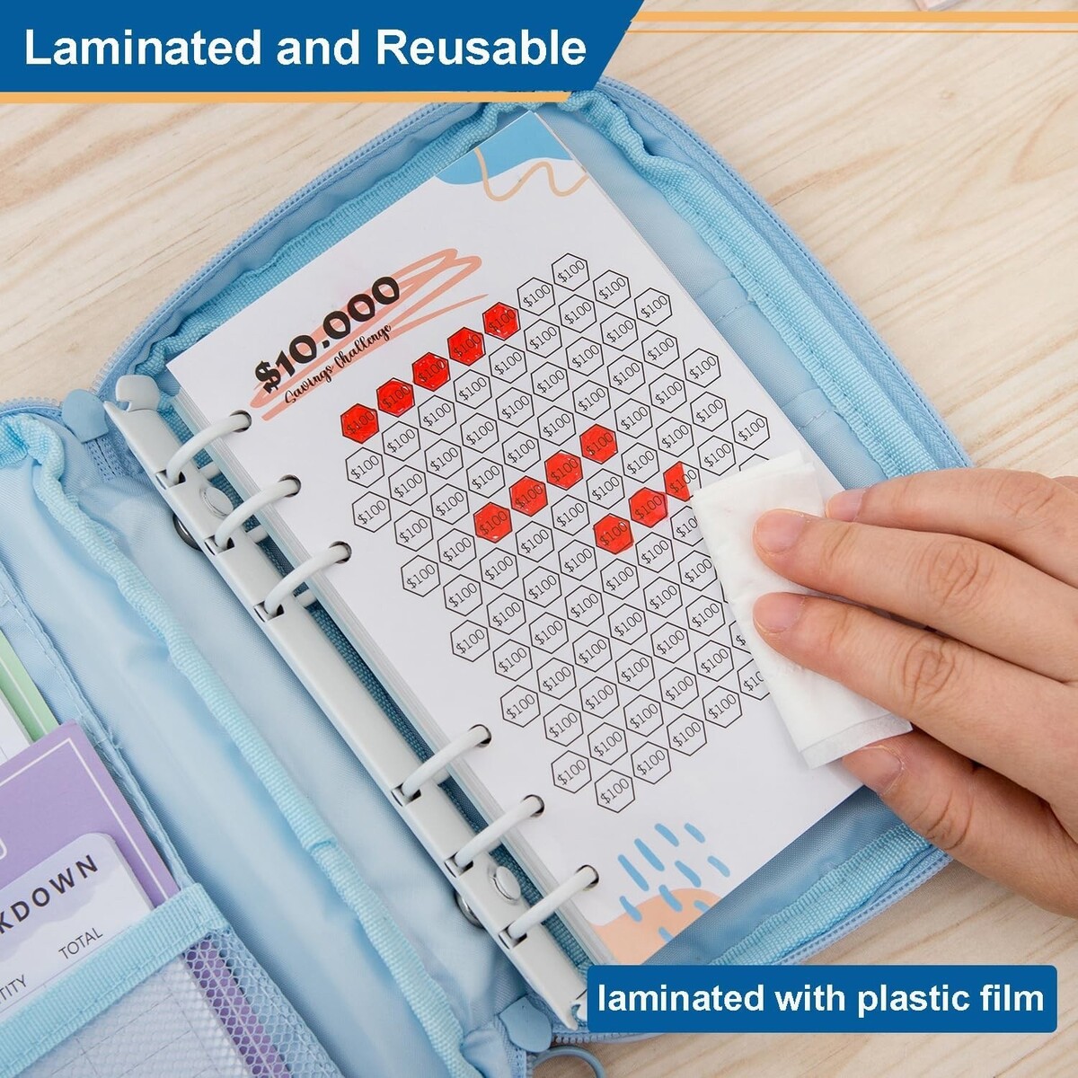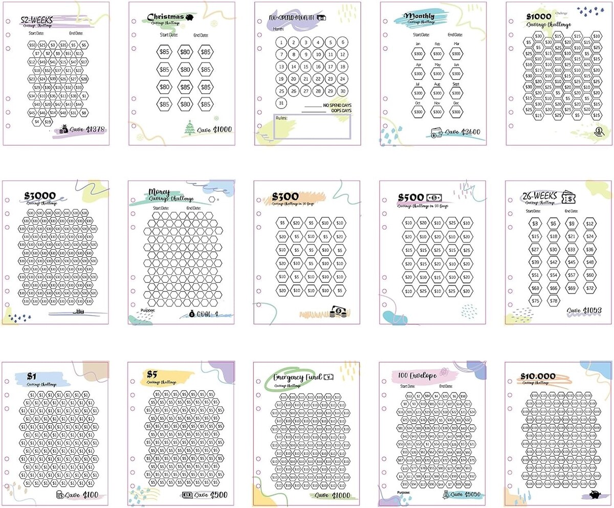 15 Laminated Money Savings Challenge Sheets Cash BUDGET Cards Reusable 6 Ring A5