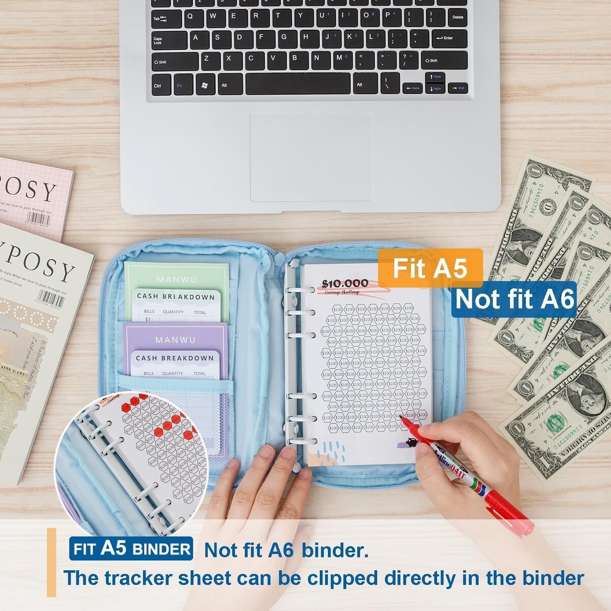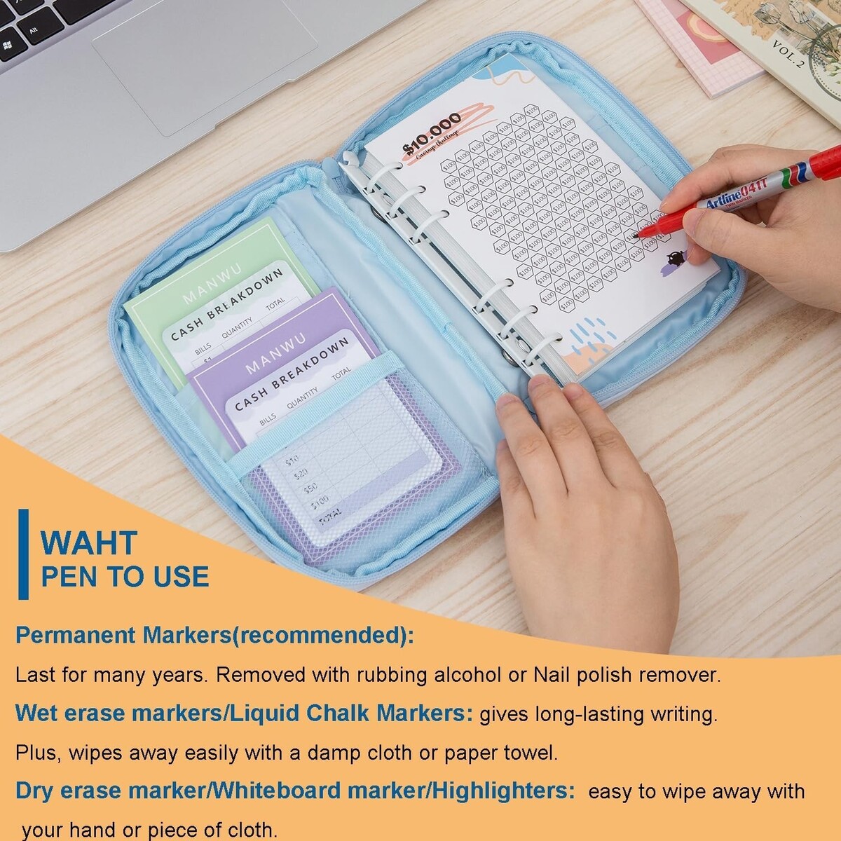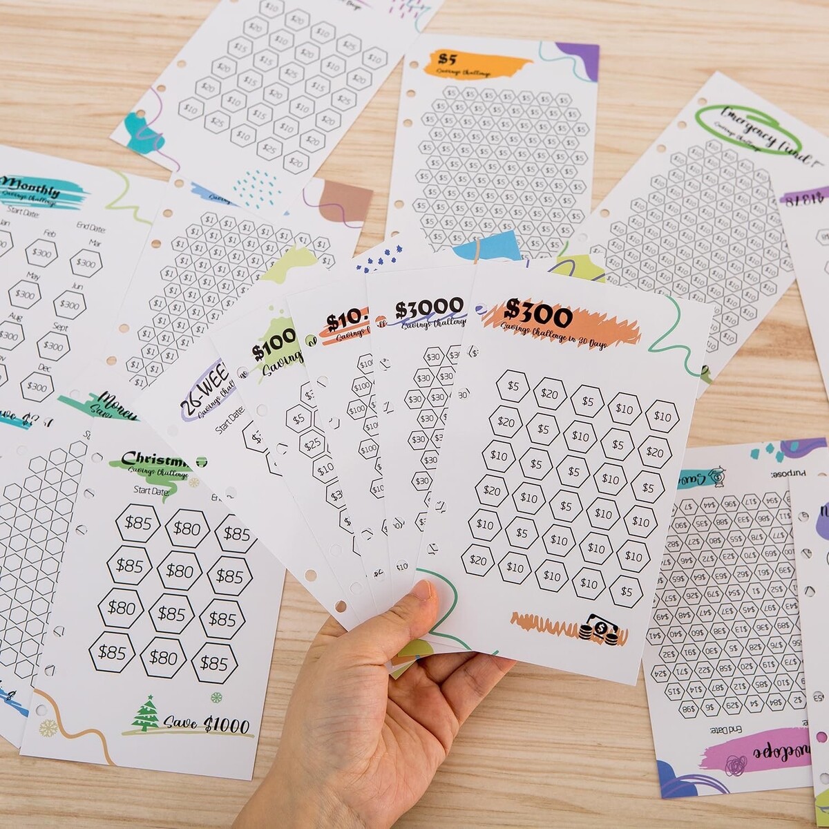 These 15 Reusable Laminated Money Savings Challenge Sheets aren?t just a budgeting tool?it?s a financial glow-up in 15 different savings challenges. Designed to fit your A5 binder, these sheets turn saving your hard earned money into a game you?ll actually want to play. This set of 15 savings challenge cards are laminated so that they can be used over and over again for future challenges. You can use almost any kind of markers. Permanent Markers (recommended) - Use rubbing alcohol to remove the ink. Dry Erase Markers - Easy to wipe away with your hand or cloth. it?s perfect for anyone looking to build savings with a splash of personality.