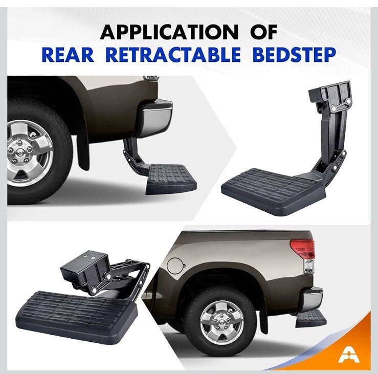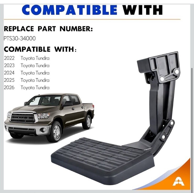 The product is a retractable bed step designed for the 2022-2025 Toyota Tundra. It is made of ABS and aluminum materials in a black color. It includes all necessary items for installation, features easy installation, and comes with a 1-year manufacturer warranty. The step is a direct replacement part for the rear tailgate of the vehicle, providing a strong and durable solution for accessing the rear of the truck with ease.