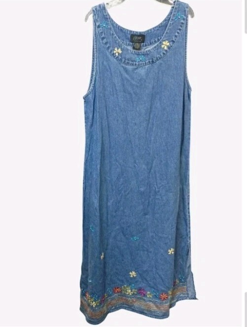 This denim full-length dress in size medium features floral embroidery, a sleeveless design, round neckline, and pullover closure. Made from 100% cotton denim, it is perfect for casual occasions during the summer and spring seasons. The dress has a vintage Grannycore style with a shift and maxi silhouette, and is adorned with colorful multicolor flowers, adding a touch of whimsy to any wardrobe.