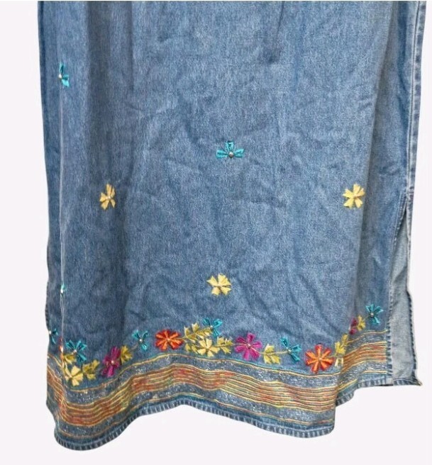 Denim Full Length Dress With Embroidered Flowers Size Medium Whimsy Grannycore