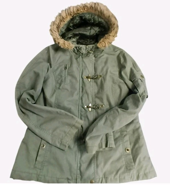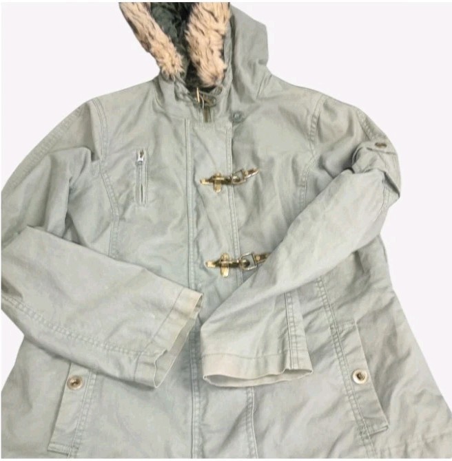 Y2K Womens Quilted Military Faux Fur Coat With Hood Brass Clasps Gorpcore Size L