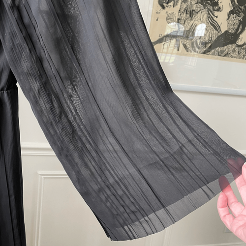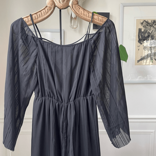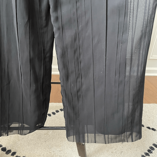 H M women?s black wide neck or cold shoulder wide bracelet length sleeve jumpsuit with wide straight leg and a variegated, ribbed, lightweight and airy chiffon type material. The sleeves are sheer, but the torso is lined all the way in the front and from about the mid back down. 100% polyester with cold shoulder strap and strap detail in the back before dipping to a V-neck. Size 4. Laying flat measures 12 inches straight across the waist stretching to 16 inches without much resistance, 17 inches armpit two and a 30 inch inseam with the leg opening measuring 11 inches straight across