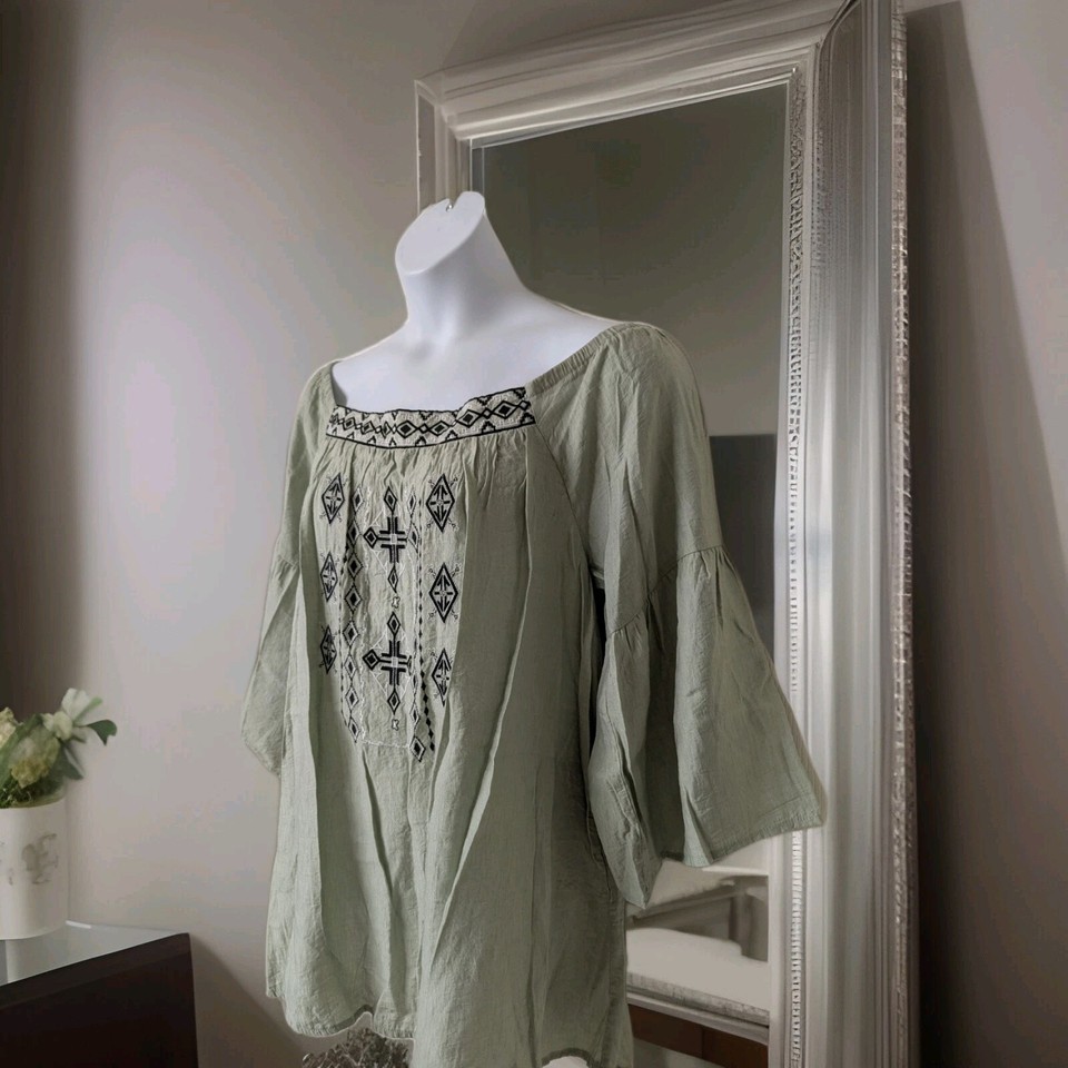 Forgotten Grace Top Women's 2X Embroidered Sage Boho Tunic. Condition is Pre-owned - Excellent. Shipped with USPS Ground Advantage.