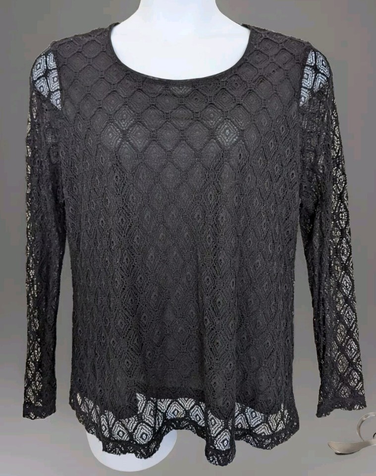 Chico's Women Top Blouse Shirt Size 3 Black Lined Lace Scoop Neck Long Sleeve . Condition is Pre-owned. Shipped with USPS Ground Advantage.