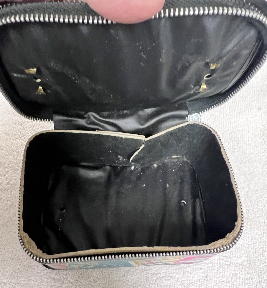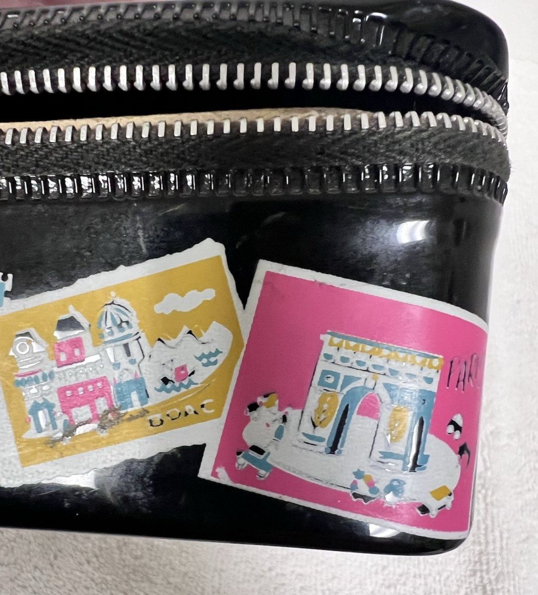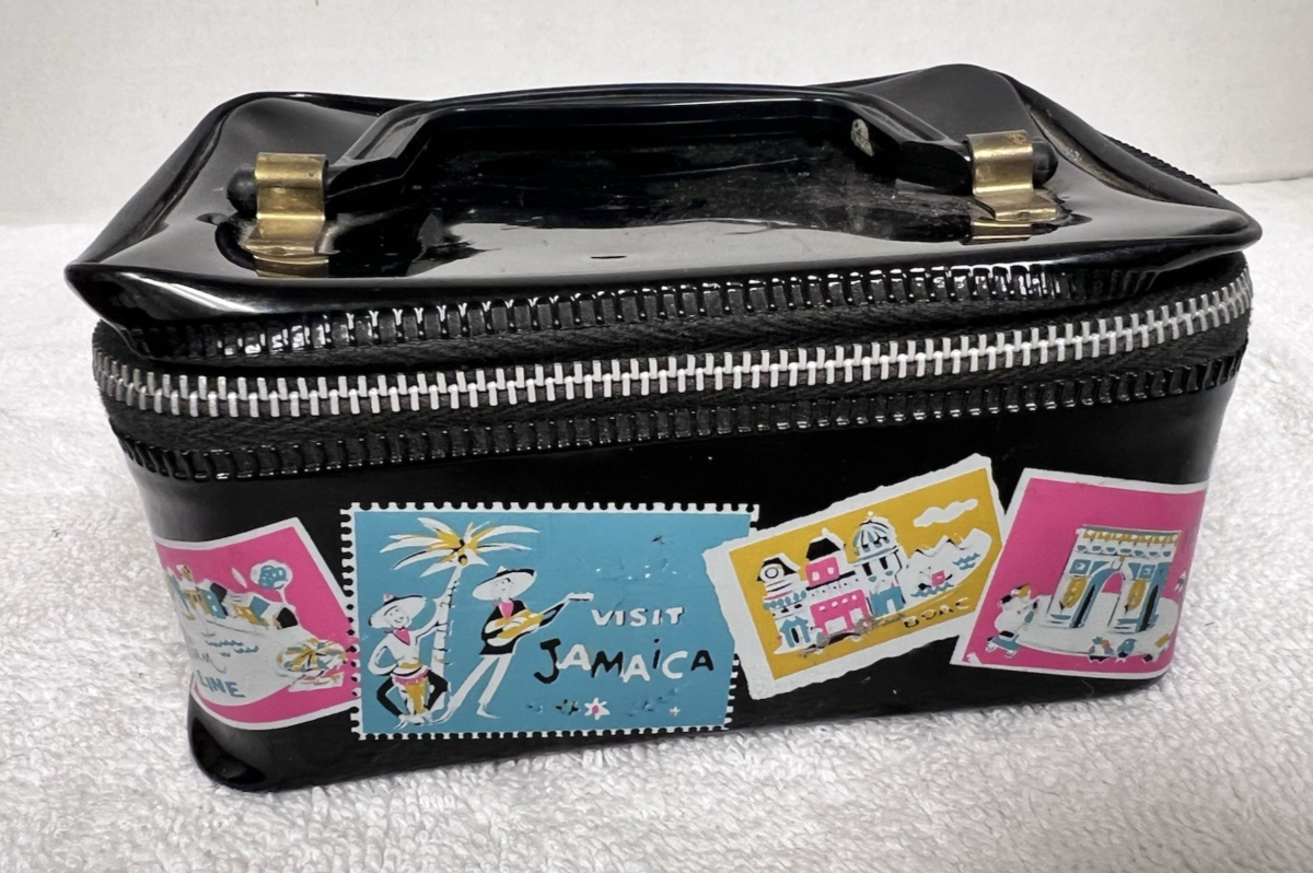 Vintage Hasbro Black Vinyl Doll Toy Paris Jamaica World Travel Bag Suitcase. Rectangle vinyl travel case suitcase measures approx. 5 1/4" long, 3 1/2" wide, and 2 5/8" tall/deep. Very good condition, countries visited designs on travel bag are in very good condition, no tears or cracks to the vinyl I find, plastic handle in very good condition marked with Hasbro and Made in USA, zipper works, inside might need some cleaning but in very good condition. See pictures.