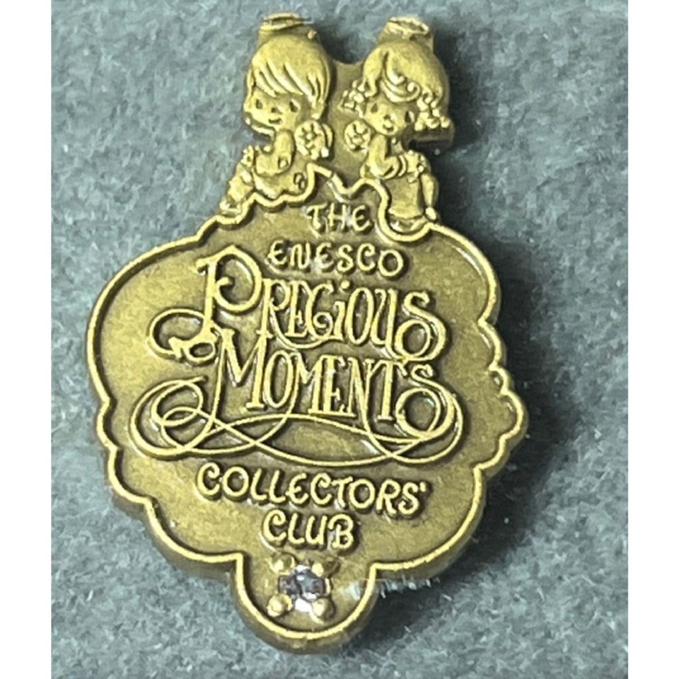 Vintage Enesco Precious Moments Collectors Club lapel pin featuring the classic Precious Moments children logo above ornate script lettering. This gold-tone membership pin includes a small clear accent "stone" and comes in its display case, making it a nice collectible piece for Precious Moments fans or pin collectors.