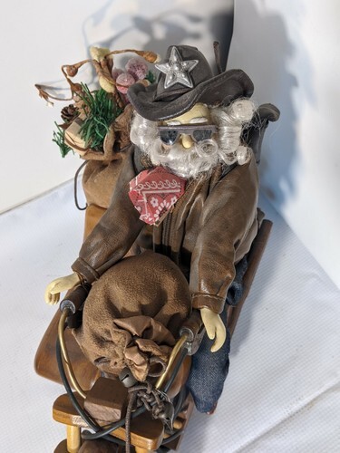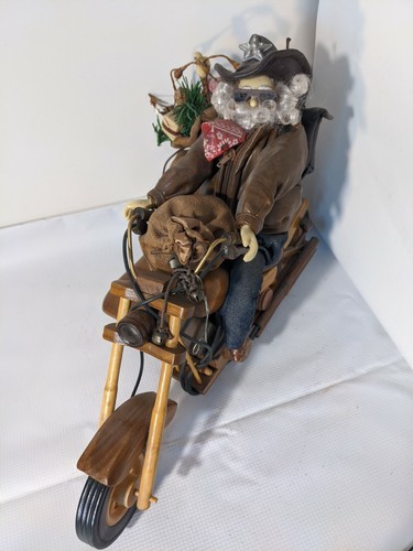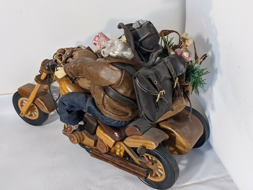 In vendita c'e un Babbo Natale usato con occhiali da sole e giacca di pelle. Figura che guida un sidecar per motocicletta in legno. La moto e lunga 14 pollici x larga 5 pollici e alta 10 pollici.