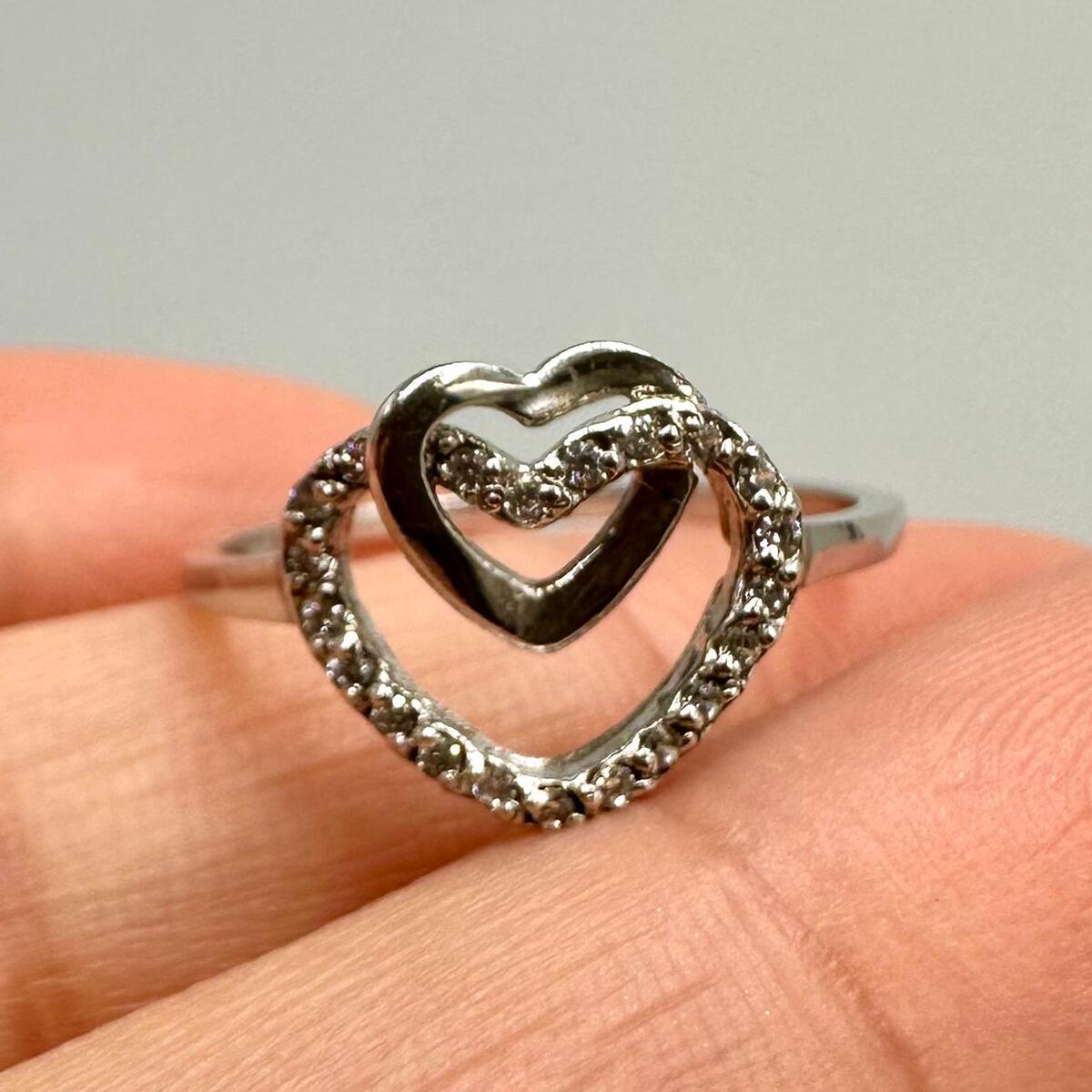 Vintage 925 Sterling Silver Double Heart Ring with Sparkling Stones. 1.31g
