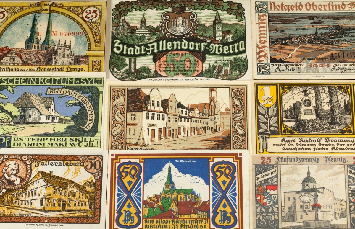 This lot will include 25 individual notgeld notes from Germany after World War I. All will be in Extra Fine to Uncirculated (XF-UNC) condition. Face values between 5 pfennig to 5 mark. City views theme; landmarks, famous buildings and landscapes.