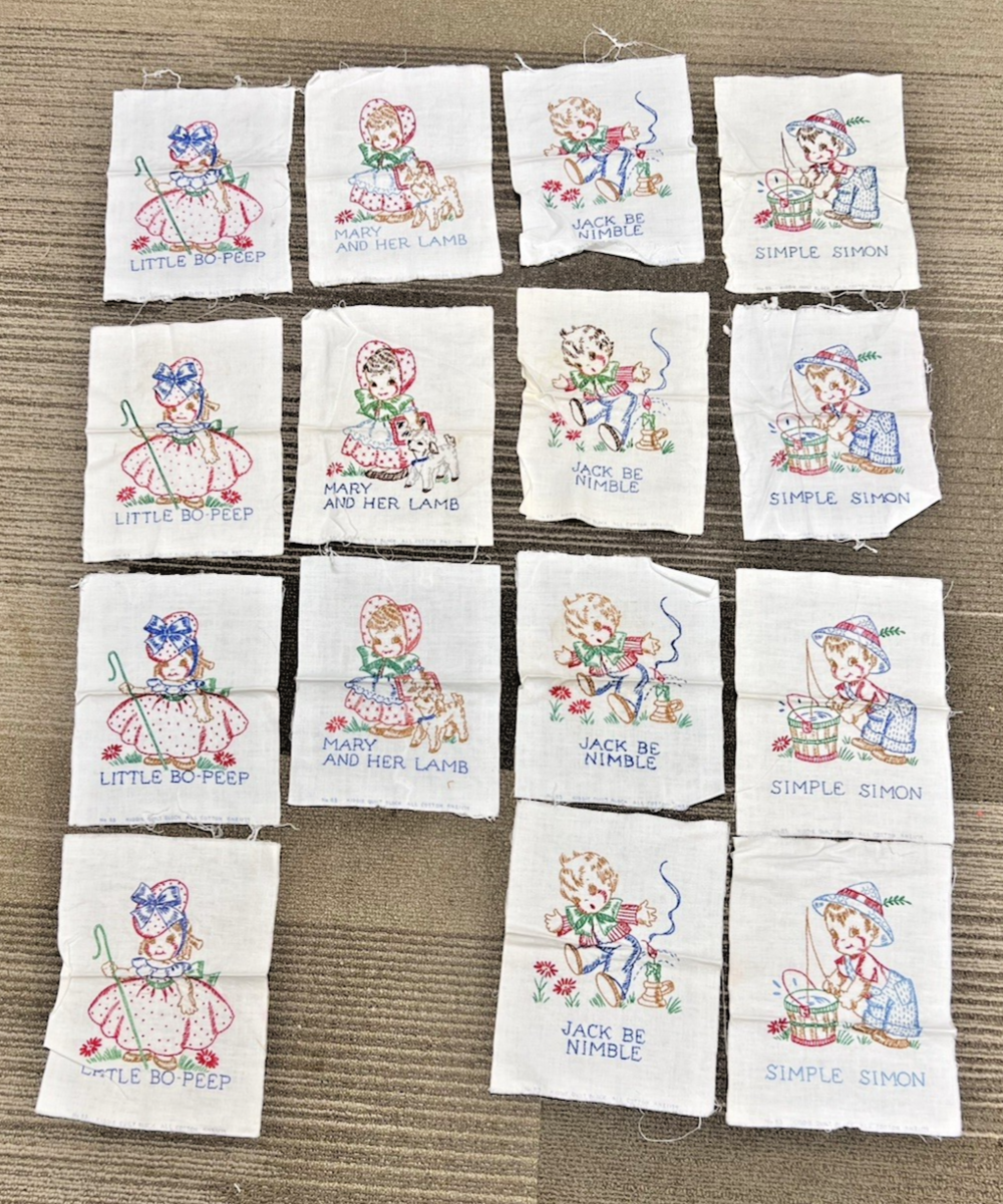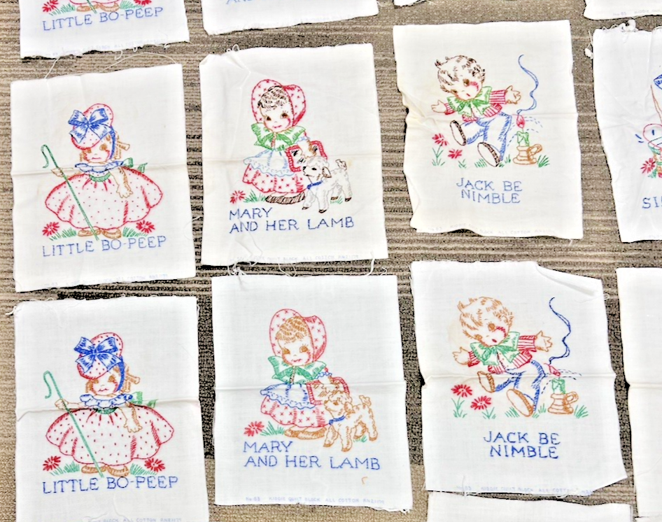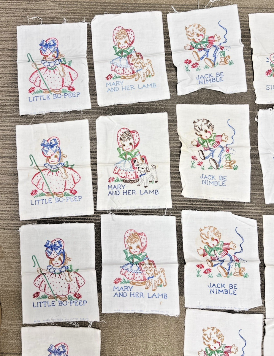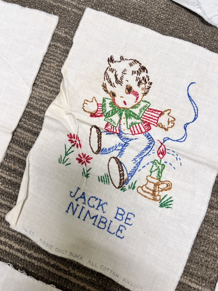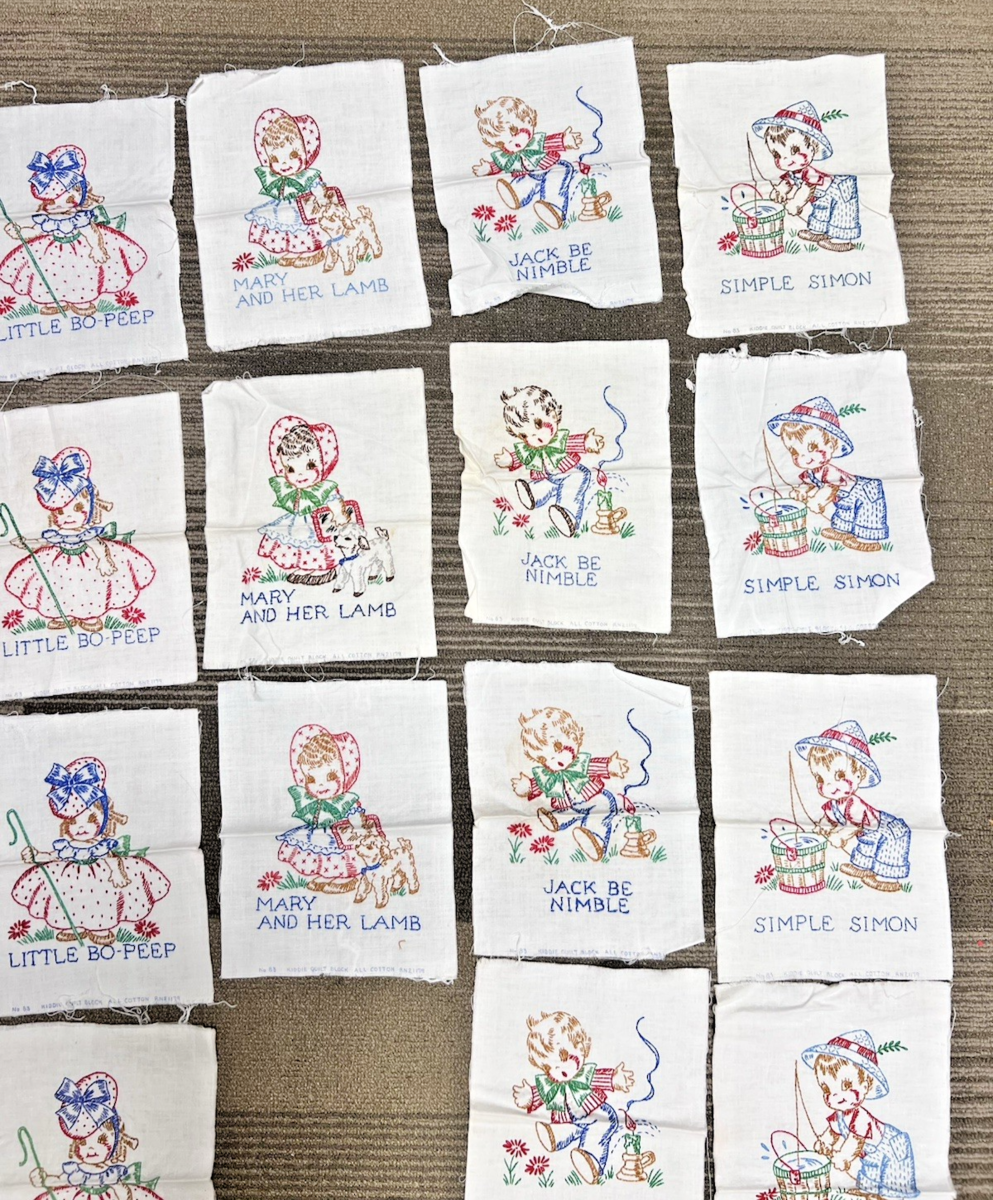 15 Vintage Embroidered Cotton Kiddie Quilt Block Nursery Rhymes Bo Peep. Nice small lot of 15 Kiddie Quilt blocks children's nursery rhymes, Lil Bo Peep, Mary had a lamb, Jack Be nimble, Simple Simon, quilt blocks measure approx. 7 1/2" x 10" although some cut slightly different, very good condition, clean no stains. See pictures.